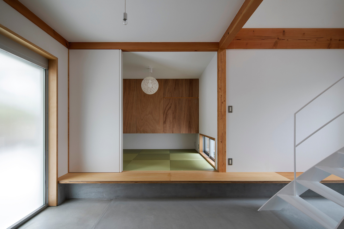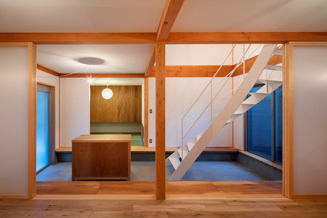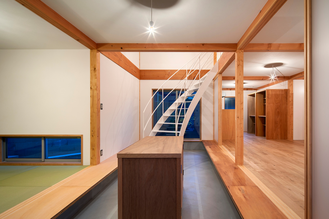 内部は柱・梁が1.5間角のグリットで現された真壁構造とした。一つ一つのグリッドが強調されるため空間に強い指向性が生じ、規定された視線の先には斜め視点での外景が伺える。