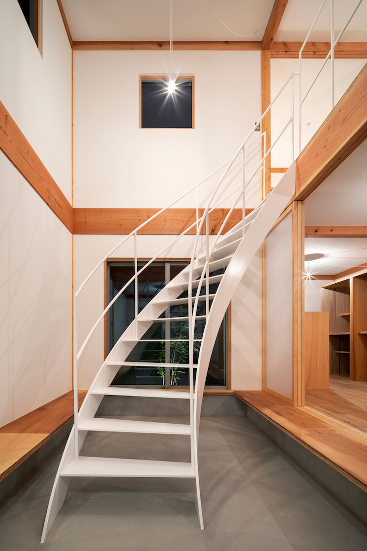 また階段形状を90°扇型とし、上下移動の際に螺旋状に視線が90°捻られる計画とした。