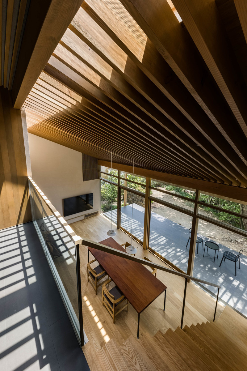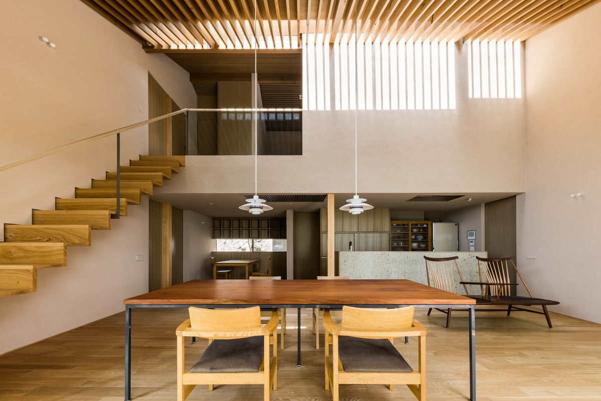 敷地全体が北から南へと緩やかに傾斜していることに呼応し、建物の屋根も南に向かって下がっていく構成としています。2階のエントランスからは吹き抜けを介して、自然な流れで1階のリビング・ダイニングへとつながっていくよう意図しました。