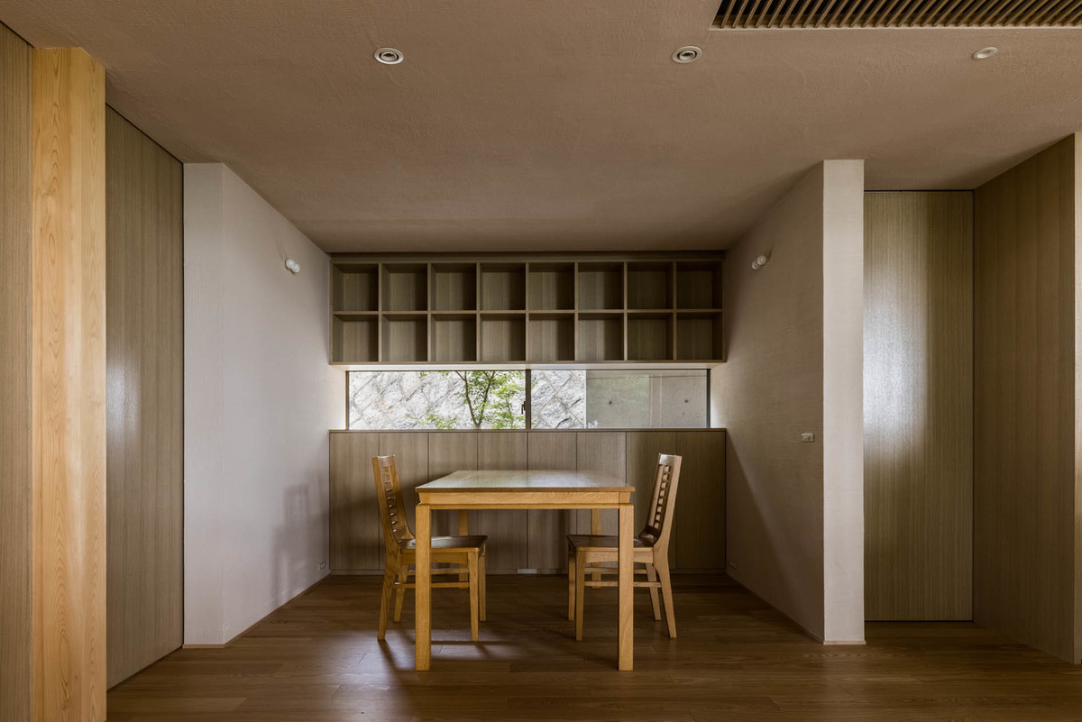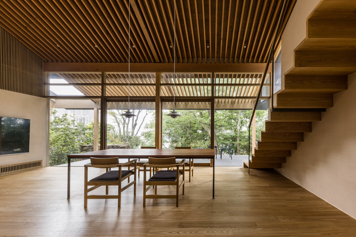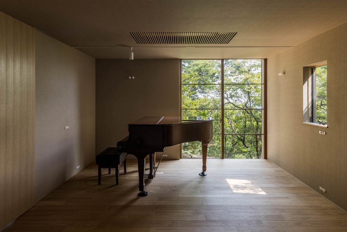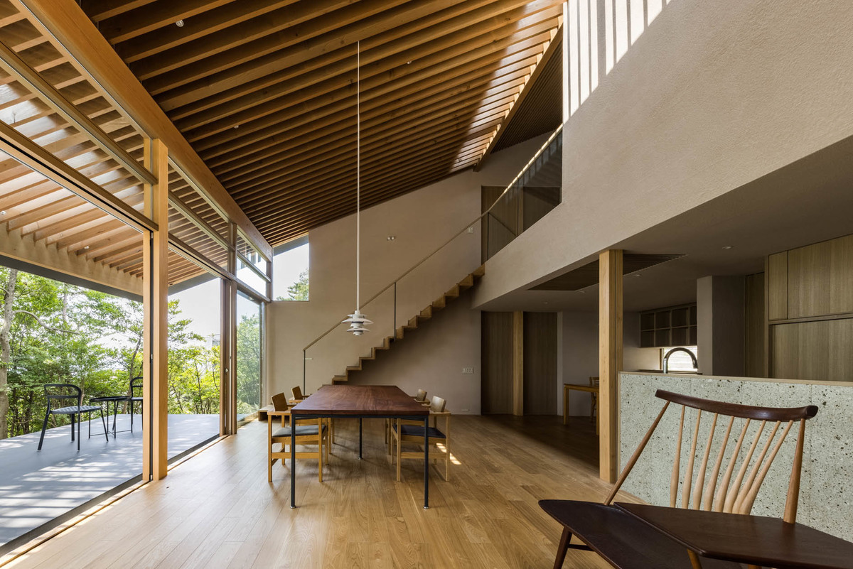 施主は、この豊かな緑とつながるような暮らしを望まれていたため、主な生活空間はあえて1階に配置しています。