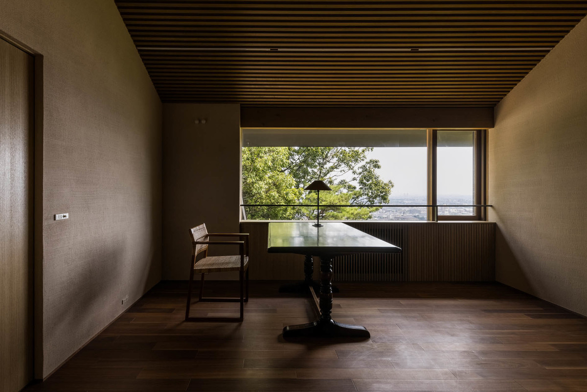 建物へは敷地北側の道路から、2階レベルに架けられたブリッジを通ってアプローチします。エントランスに隣接する2階の書斎からは、遠くに広がる街の風景を楽しむことができます。