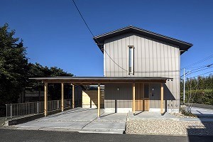 愛知県豊橋市内、次郎柿の産地で知られる緑豊かな地域に、単世帯で住まう住宅の計画。敷地は矩形、ほぼ平坦な敷地に北東の二方向接道となる角地に位置する。農業を営む近隣には昔ながらの簡素なつくりの農業用倉庫も多くみられ、その街並みに馴染むよう切妻屋根を架けた矩形の二階建てに土庇を構えた住居の計画とし、重心が低く安定感のある外観を添えた。土庇はアウトドア好きな家族の土間収納と直接行き来できる間取りと位置させた。暮らしの中心となる一階の洗面脱衣空間に隣接させ回遊性を持たせたLDKと二階の各居室を緑豊かな南側に配置し、接道する道路からは私事に配慮した。一階では限られた居住面積を欄間ガラスを用い空間を繋ぎ、各室の光と気配をつなぐ計画としている。要望にあった木を感じられる計画とするため、コストバランスにも考慮し、内部の仕上げは一階天井に梁床を現しとしている。壁はラワン材が主材。開口を室内に添わせ光を強く感じる計画とはせず、ラワン材に間接的に光があたり柔らかく回る光と生まれる陰影によりやさしい室内空間を提案した。