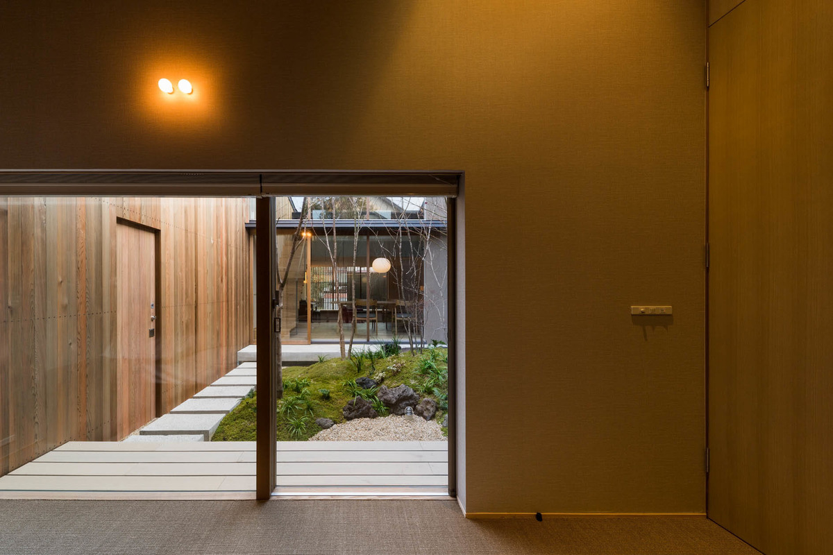 また、ダイニングから数段下がった位置にあるリビングは、塀と格子によって道路からの視線を遮られた、小さな南庭に面しています。こうした構成により、ひとつの住宅の中でも居場所ごとに異なる眺めが得られるよう意図しています。