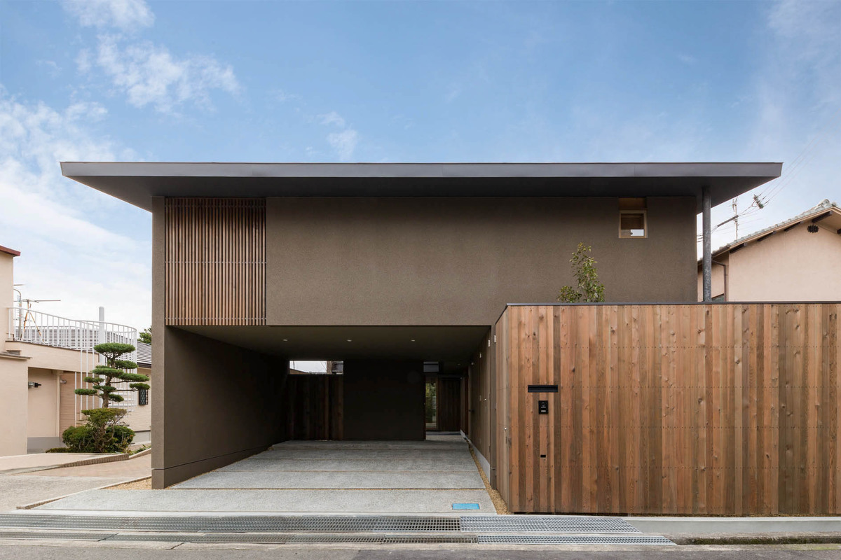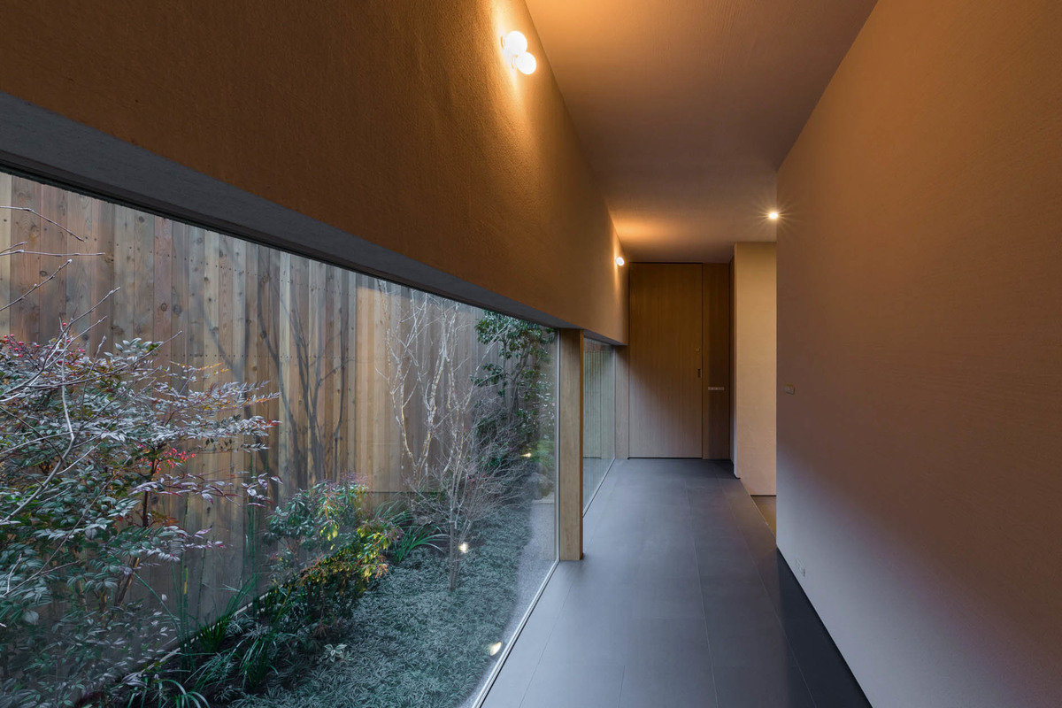 中庭に面した玄関を入ると、横長の地窓を通して西の庭が視界に入り、四季折々の緑を楽しみながら生活空間へと導かれます。この西の庭は浴室からも望むことができ、地窓の高さと敷地境界に設けた板塀によって、プライバシーを保ちながらも開放感のある眺めを実現しています。