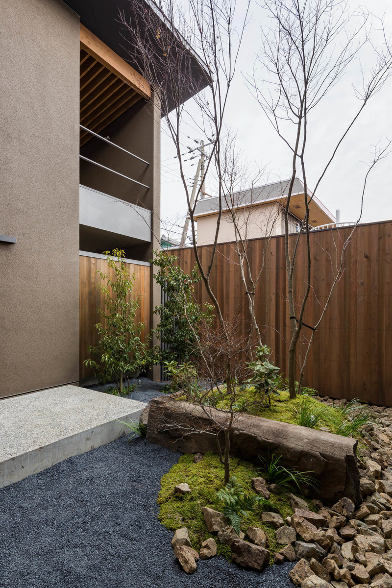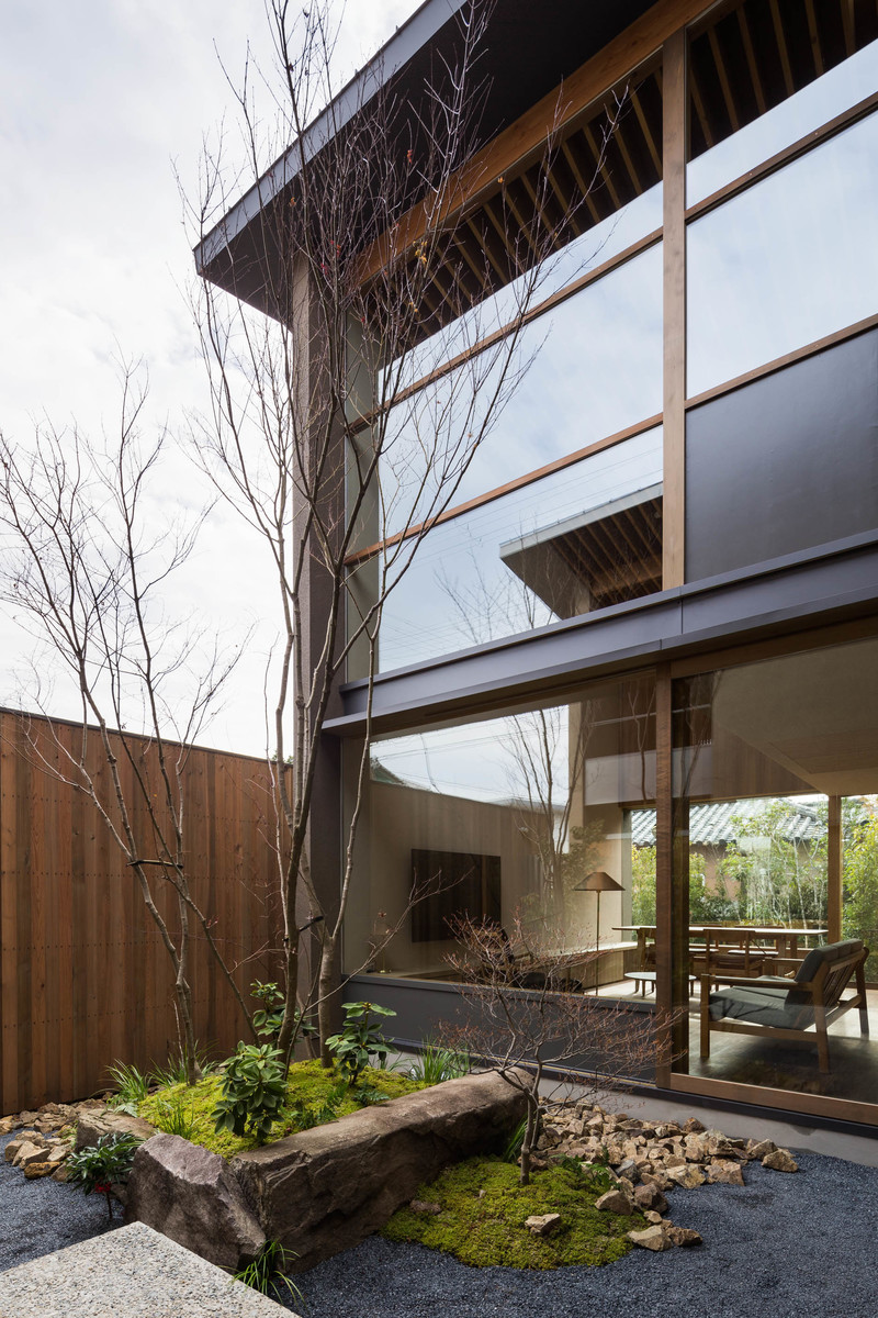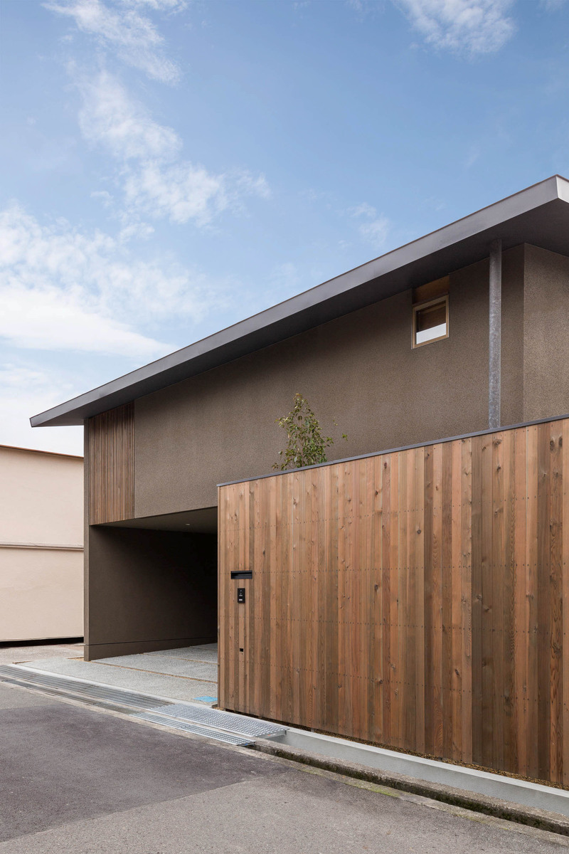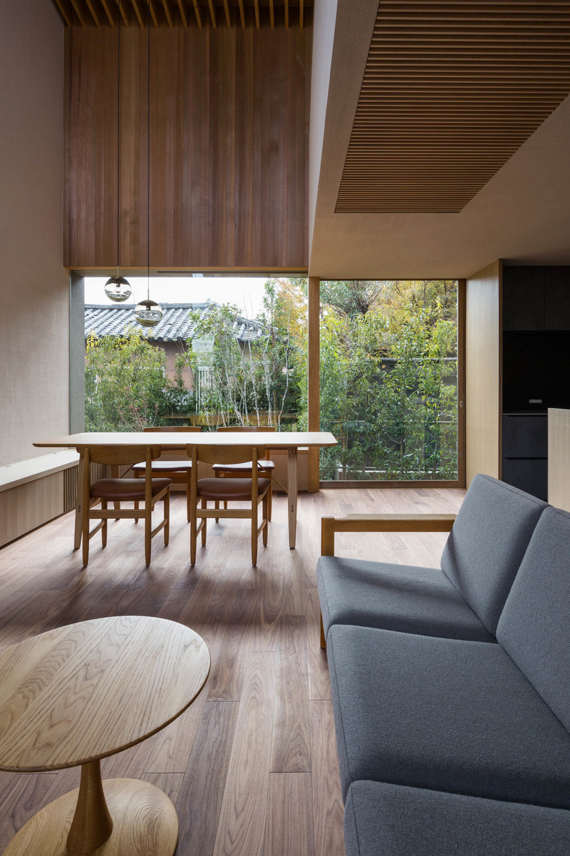 周囲には、車が一台通るのがやっとの狭い道路に沿って、背の低い建物が建ち並んでいます。そのような周辺のスケール感から突出しないよう、道路に面する建物のボリュームは抑え、街並みに与える圧迫感をできるだけ軽減することを心がけました。反対に、敷地の奥に向かうにつれて建物の高さを徐々に高くし、一番奥の空間には、天井の高い吹き抜けを設けています。