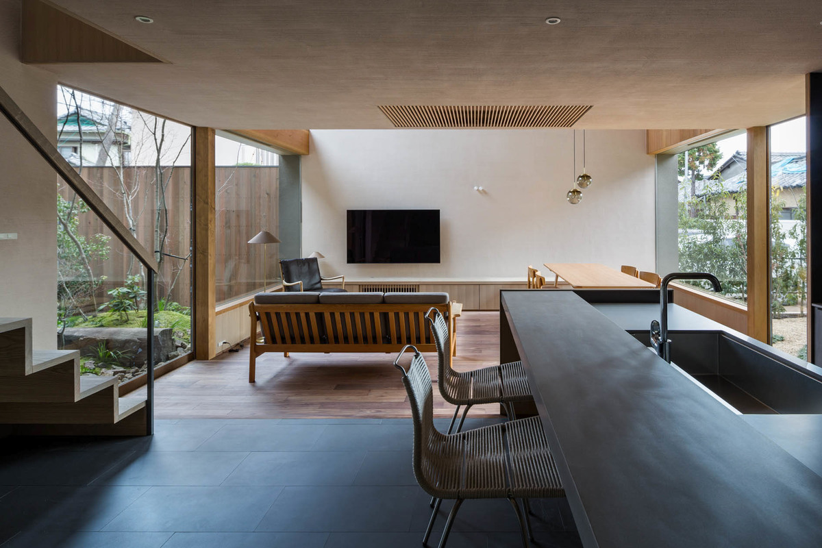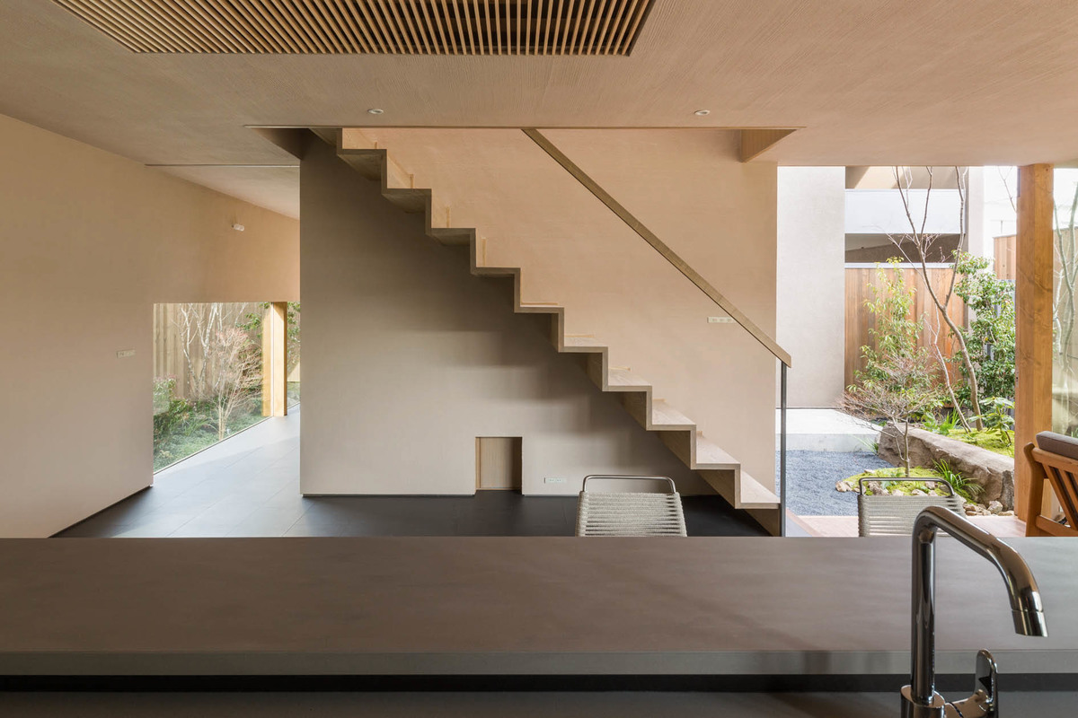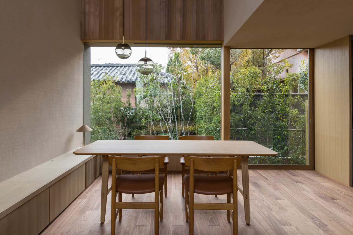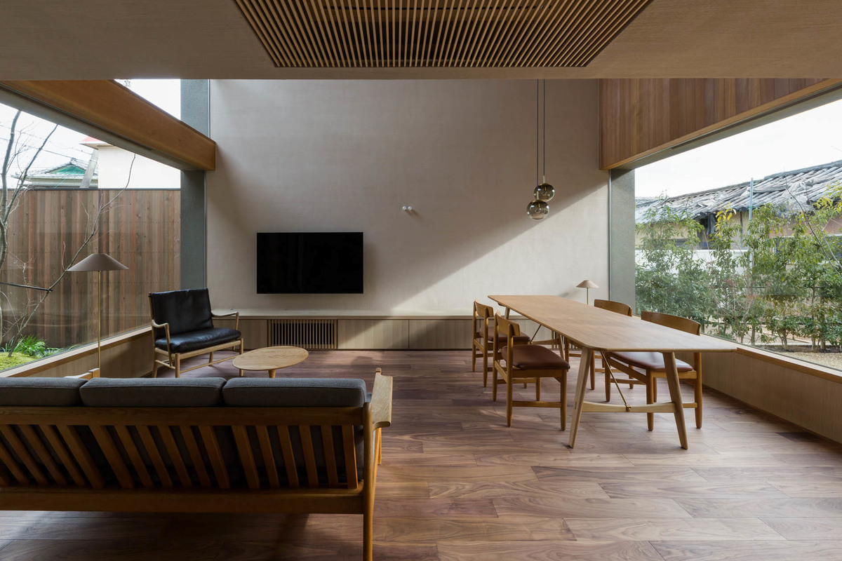 住宅が密集する地域であるため、外部に開かれた眺望はあまり期待できません。そこで、視線の抜けや自然の風景を敷地内につくり出すことを意図しました。