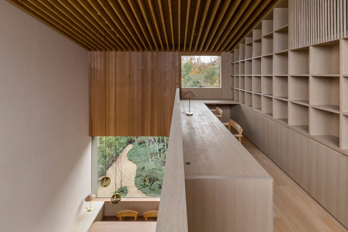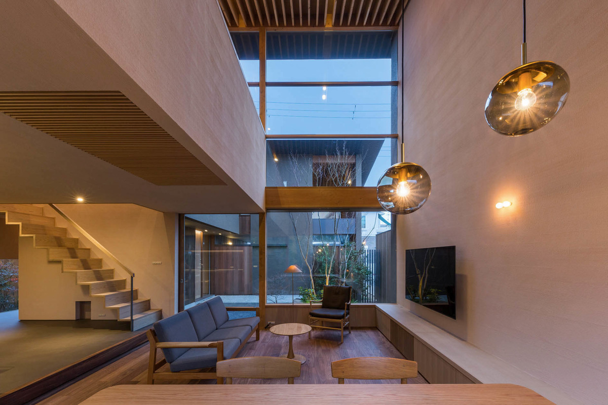 敷地の最も奥には、吹き抜けを備えたリビング・ダイニングを設け、中庭と南の庭の両方向に開いた明るく伸びやかな空間としています。この吹き抜けに面した2階部分には、家族で共有できるライブラリーを配置し、暮らしの中に多様な居場所と豊かな景色を取り込む住まいとなっています。