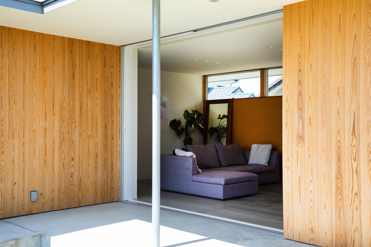 軒を深く出したアウターリビングと広間が土間的に繋がり、内と外が緩やかに繋がります。