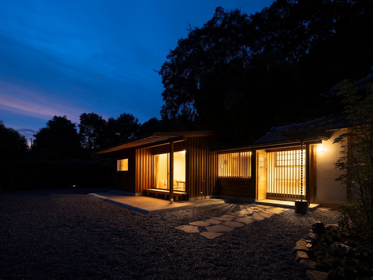 外観には竹のルーバーを用い、周囲の風景と自然に溶け込みながら、母屋と離れをやわらかくつなげています