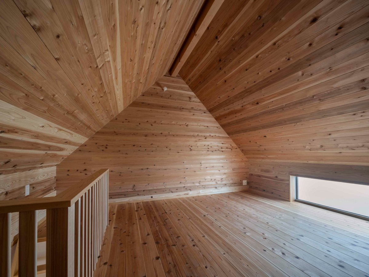 3mの柱だけを使い、屋根裏の勾配を活かすことで二階の部屋を確保し、コストを抑えながらも、のびやかで気持ちの良い空間をつくりました