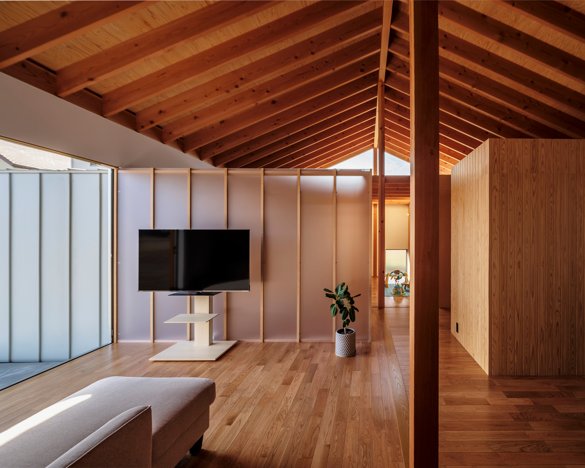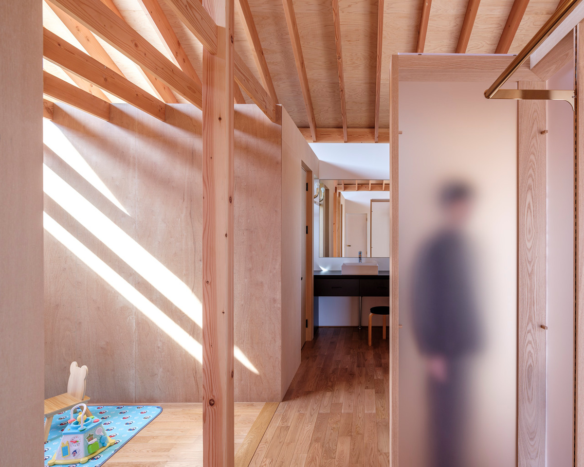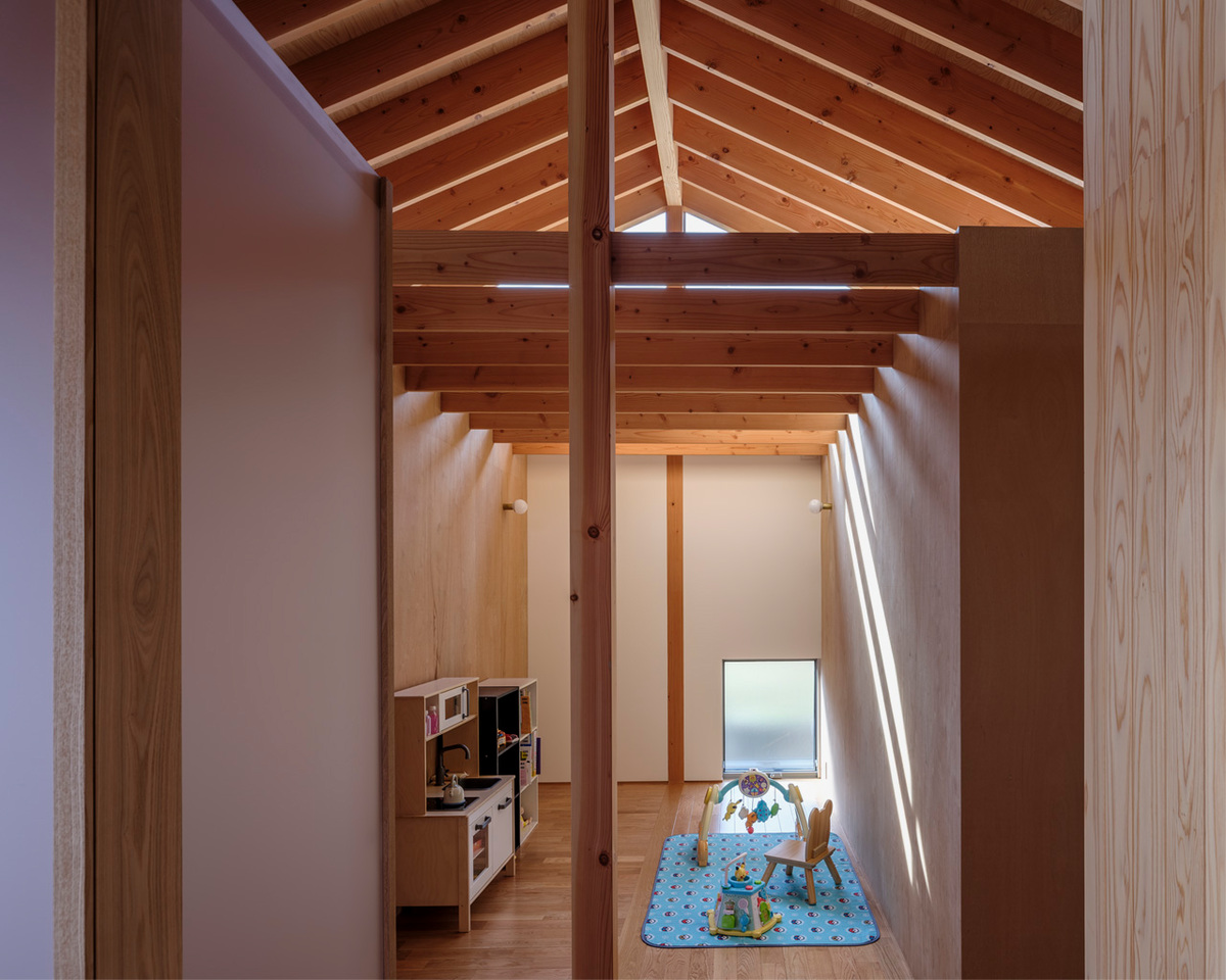 そこでまず、家族の安全を担保するために最低限の窓を孔けた壁で内部を囲み周囲から閉じた。次に、公園の大きなスケールを受け止めるため敷地の長手方向いっぱいに切妻の大屋根を掛けた。それにより生まれた屋根形状に沿ったヴォイドから光が降り注ぐ明るい内部を作った。大きな気積を持つワンルーム(LDK)に対し、個室(子供室、WC、納戸など)や間仕切り壁を小さなスケールで点在させ、その間を建具で分割せずに曖昧な場を繋げることで、光や風を共有した。加えて、個室の天井を吹抜や透明な素材とすることで個室内も光を精一杯享受した。