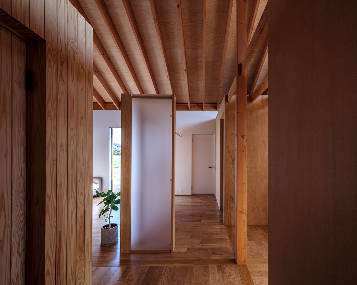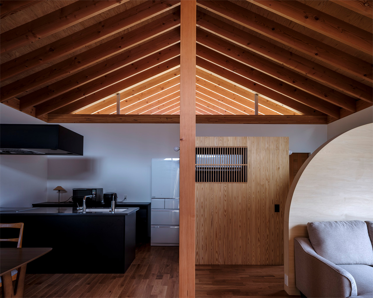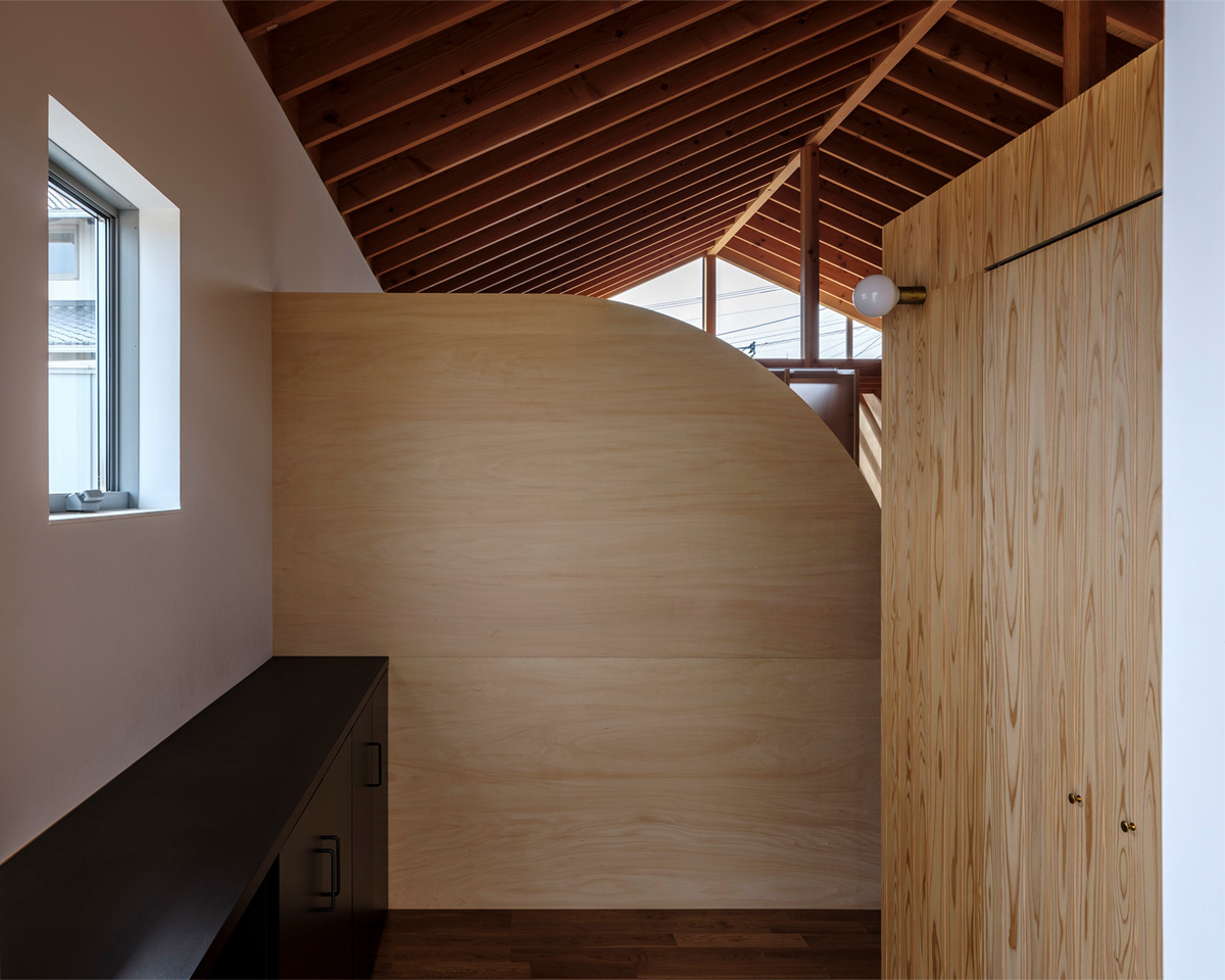 そこでまず、家族の安全を担保するために最低限の窓を孔けた壁で内部を囲み周囲から閉じた。次に、公園の大きなスケールを受け止めるため敷地の長手方向いっぱいに切妻の大屋根を掛けた。それにより生まれた屋根形状に沿ったヴォイドから光が降り注ぐ明るい内部を作った。大きな気積を持つワンルーム(LDK)に対し、個室(子供室、WC、納戸など)や間仕切り壁を小さなスケールで点在させ、その間を建具で分割せずに曖昧な場を繋げることで、光や風を共有した。加えて、個室の天井を吹抜や透明な素材とすることで個室内も光を精一杯享受した。