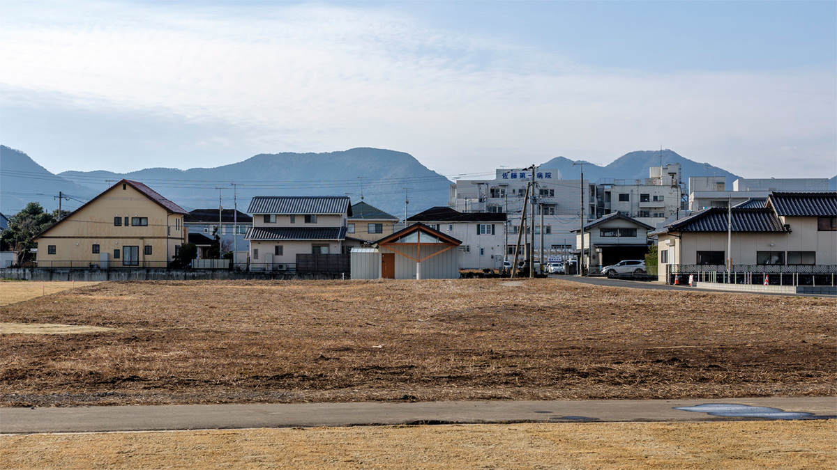 宇佐平野に位置する平坦なこの地域は、役所や小学校、病院が徒歩圏内にあるため利便性が良く、近年田畑を埋め立て新築住宅が建ち始めている。敷地北側は、近年整備された都市計画公園や昔ながらの田畑風景が広がる自然豊かな環境であるが、南側は造成により地盤レベルが1m高く住宅が密集しており、特に南隣家からの見下ろしの視線が気になった。