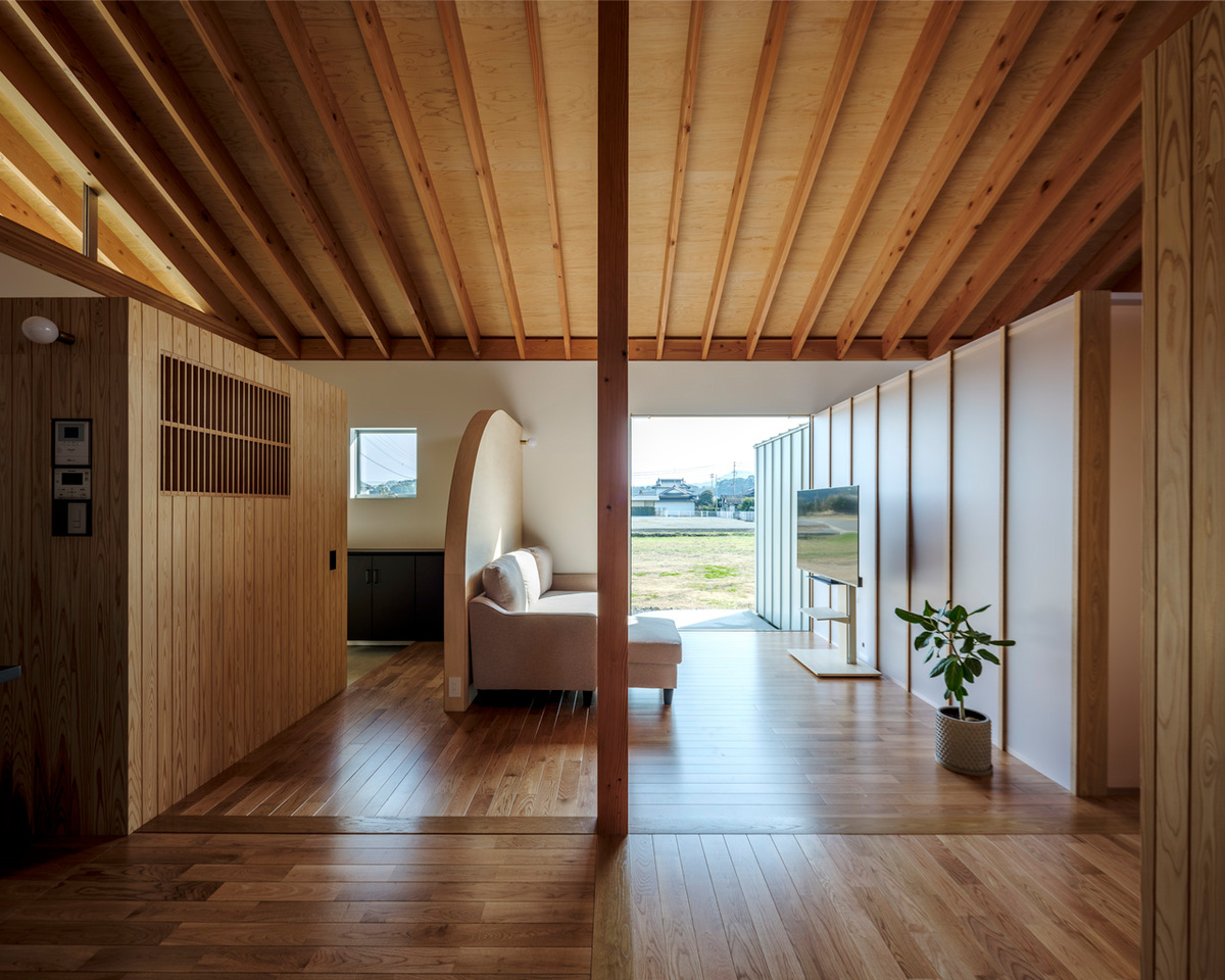 大分県宇佐市に建つ、夫婦と子のための住宅である。出産を機に自然豊かで静かな環境で子育てを行うために、新築住宅の計画が始まった。