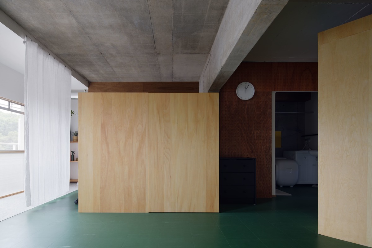 北側傾斜の敷地を造成して建てられた5階建て壁式鉄筋コンクリート構造のマンションは、北側に大分市中心市街地、南側に上野丘の森を望む立地である。4階の一室の解体を自身で行う際に、南北に景色が抜け心地良い風も抜けていくことに気が付き、この風を活かすことを計画の主軸とした。計画においては設計者の仕事場を設ける必要があった。そのため、角度を45°振った箱を中央に配置し、仕事場と居住空間を緩やかに分けている。斜めの箱は風を受け流しながら、視線を遮る機能を持たせている。この箱をきっかけに高さを抑えた箱の家具を複数配置し、猫たちの運動を促す立体的で回遊性のある構成とした。