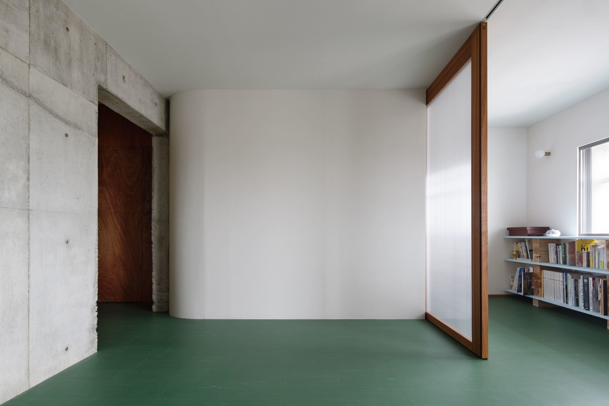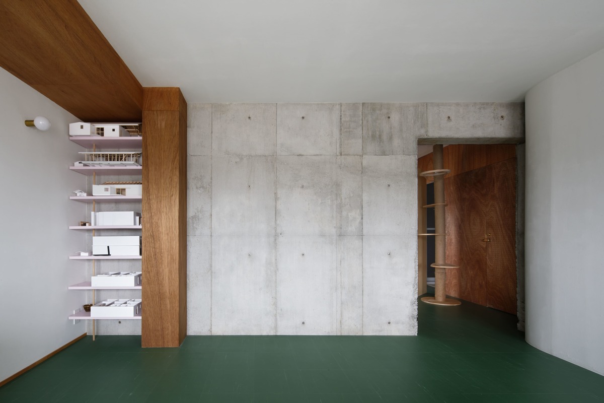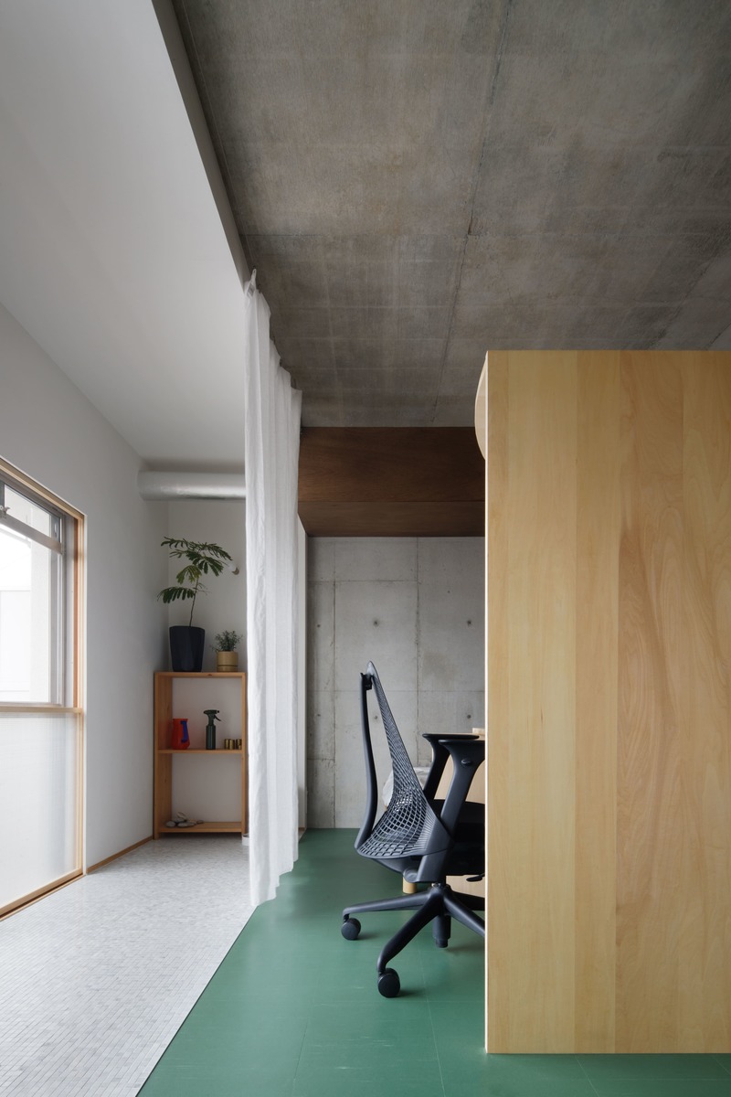 また、無断熱のRC造ゆえに温熱環境の改善を試みている。外部に面する壁・天井には断熱材を設け、既存サッシには内窓を設置した。さらには、熱を通しやすい防火鋼製建具の玄関ドアは風除室として閉じることで、熱が仕事場へ伝わらないようにした。