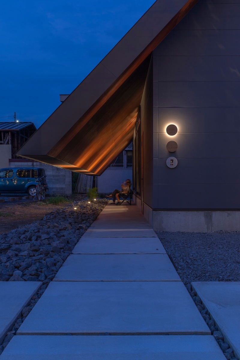 2.3mある軒下空間は物干しスペース、自転車置き場、玄関アプローチとなり、腰まで下げたこの形状が壁となり広い道路からの騒音を低減する役割も担います。
