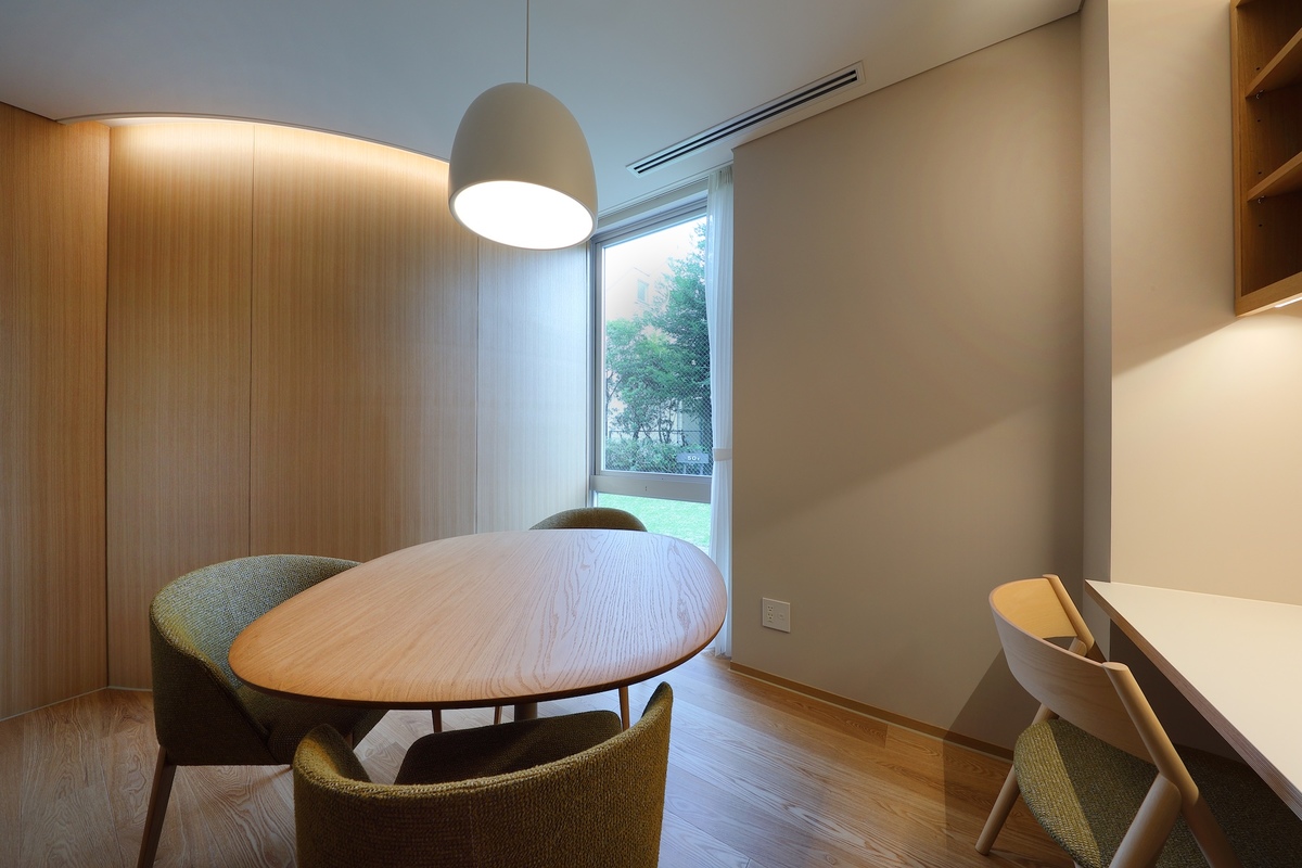 既存のクリニックはとにかく光に満ちている。光を十分に取り入れる開口を随所に設け、その明るさが本クリニックの特徴にもなっている。しかし今回の相談室にあっては室全体の照度を落とし、テーブルの上のペンダント照明によって患者とスタッフが向き合うその場所だけをほのかに照らす手法を採用した。産前の相談には喜びに満ちた明るい希望だけではなく、患者の哀しみに寄り添う必要があることも想定されること、そしてユニバーサルデザインが障がいを持たない人にとっても使いやすいデザインである発見と同じように、空間の性質は困難にある人(マイノリティー)を射程とすることで全方位的利用が可能となると考えたことがその理由である。