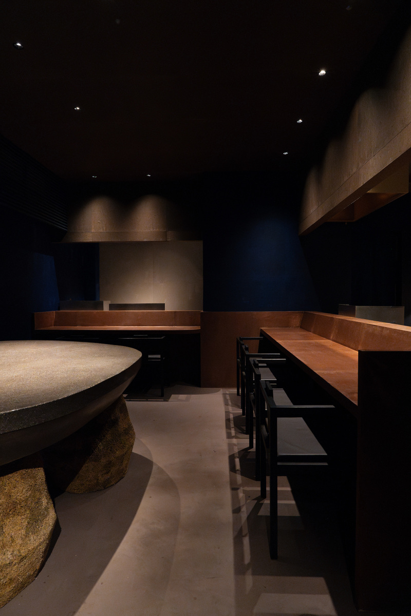 蕎麦打ちパフォーマンスをする場所は L 字のカウンターの背後に客席空間の中心となる場所に鎮座し、客席をはさみ、厨房内と蕎麦打ち台が共に店主のステージとなるように設計した。