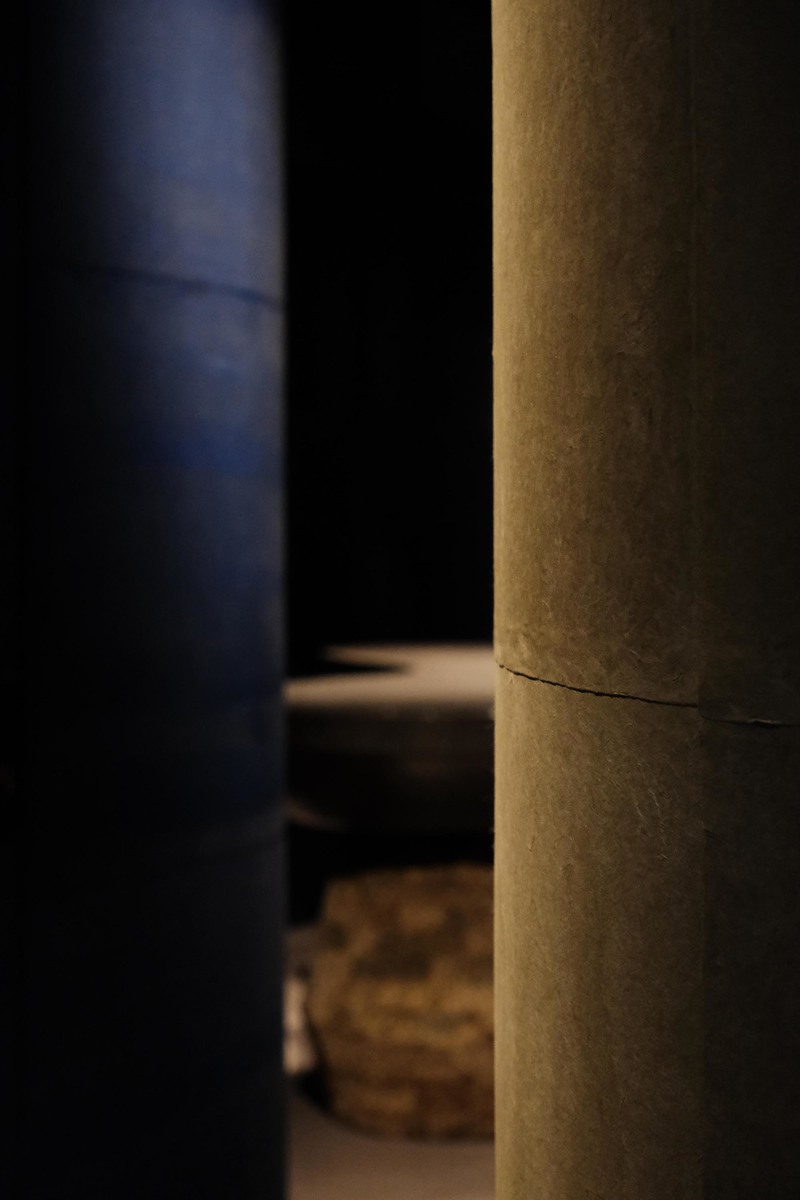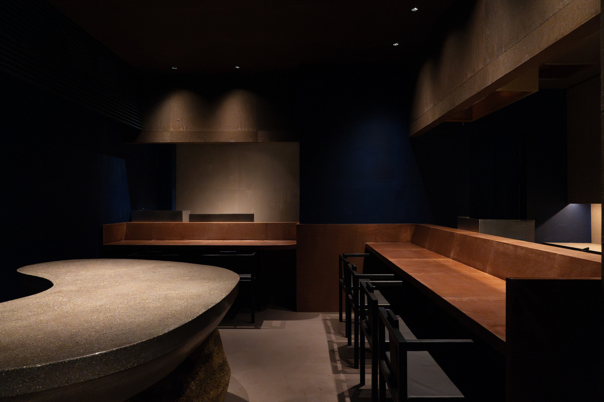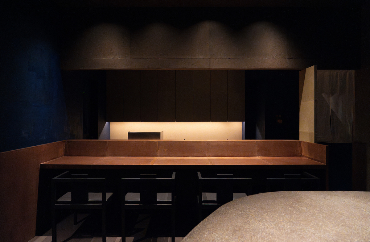 内装は海と大地、店主の藍の仕事着などから着想を得た。深い青と土を感じる色彩を基調として、和紙を使って空間をくるんでいった。
