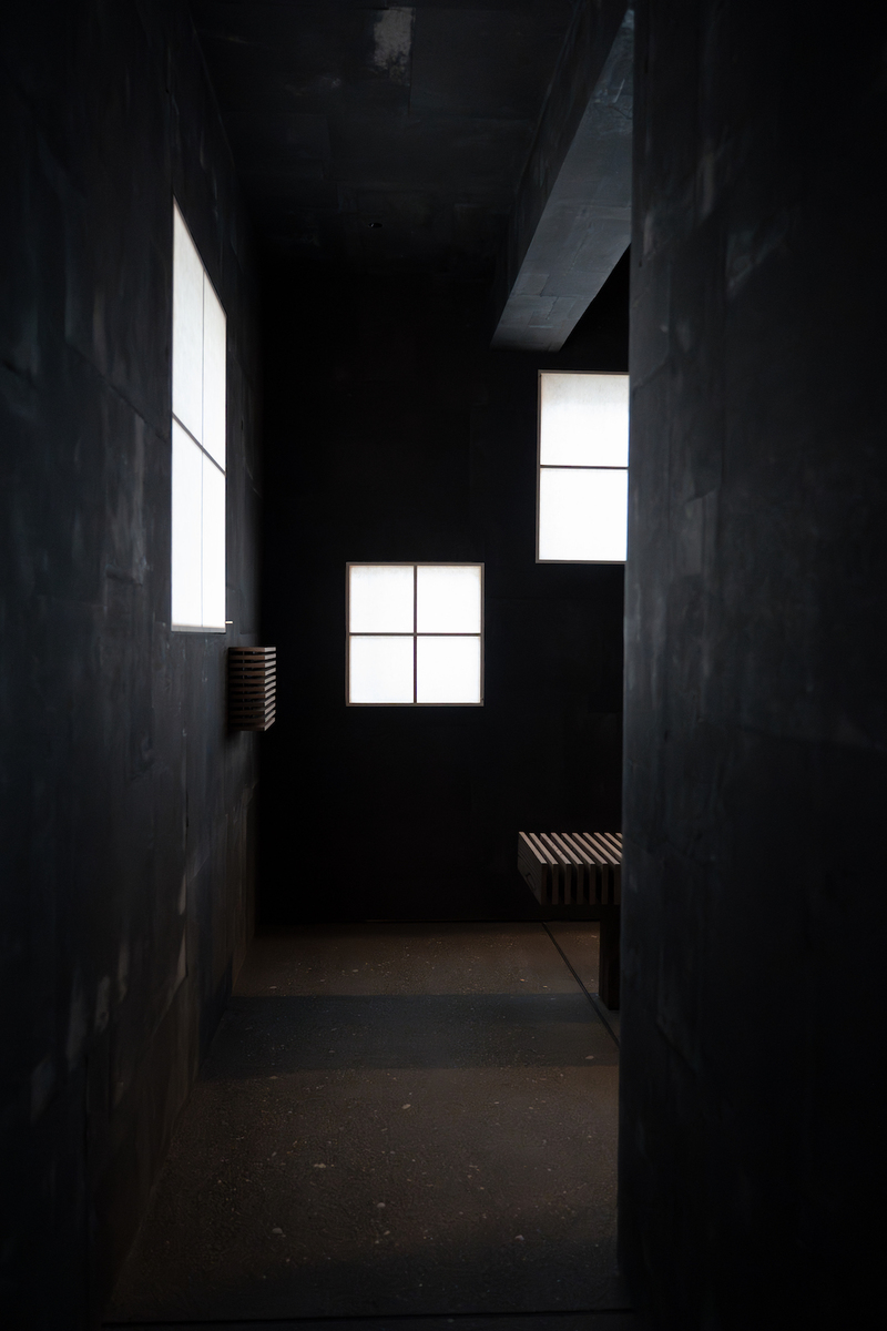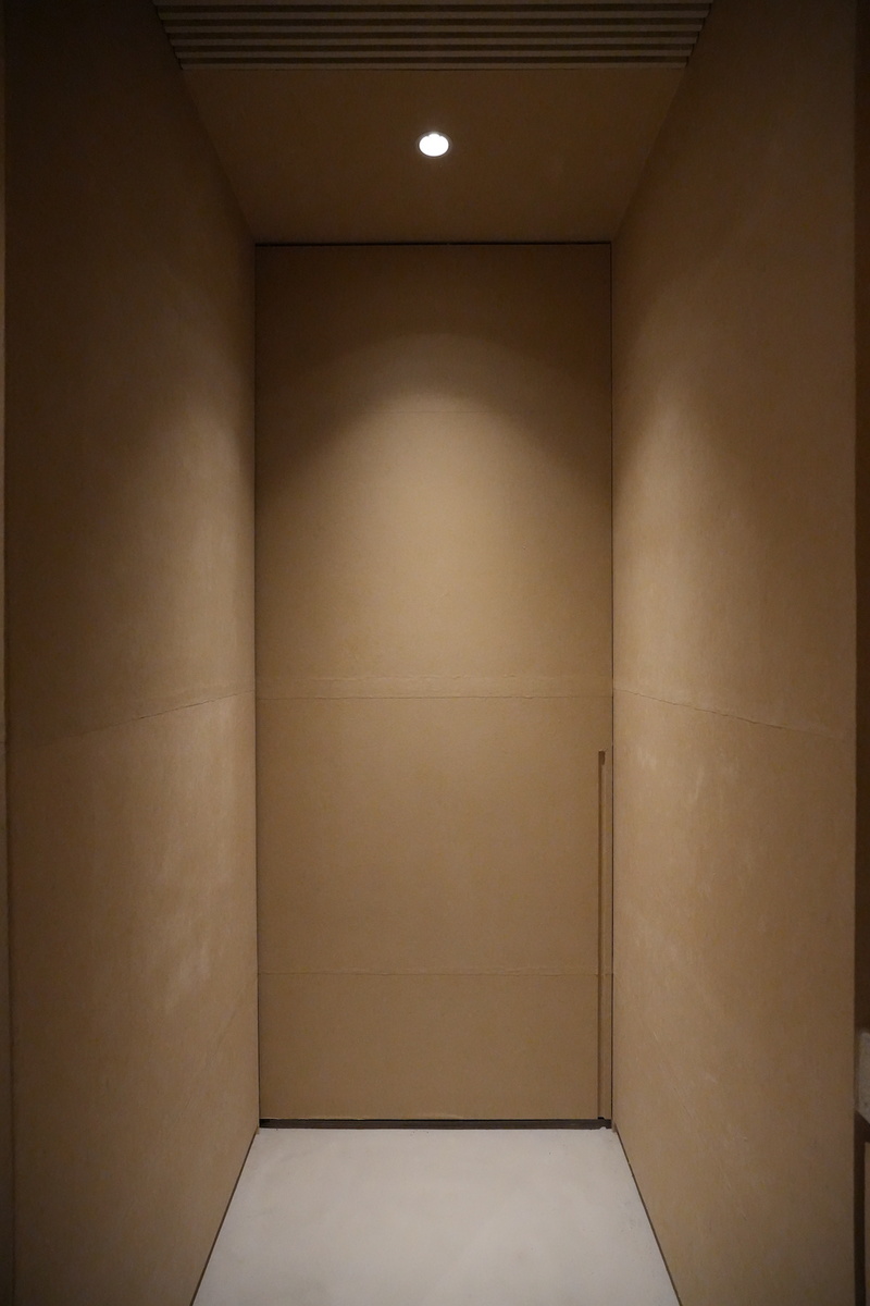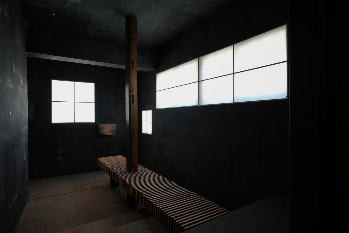 茅葺小屋、資料室を通り、トイレに至る動線となるため、浮世絵、東海道、広重などが思索の根幹にありながら、今回の場づくりを試みた。