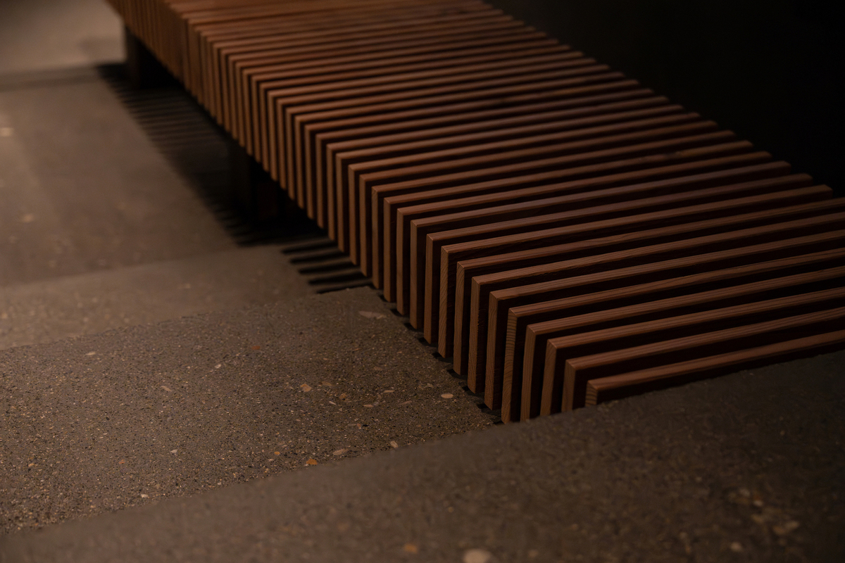 縁台や手摺、設備の目隠しとして使っている木製の格子は、改修前に壁として使われていた無垢板を別のかたちで活かしている。