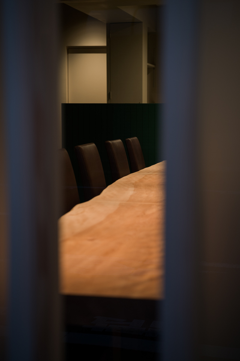 ねじれた部分を切り落とし、水平にしようとすると厚さは 30 ミリほどしか残らないことがわかった。大工とともに試行錯誤を重ね、4.3m もの長さを一度分割し、部分ごとにねじれを補正し、再度繋ぎ合わせる。という案が思い浮かんだ。接合部はより家具的に仕上がるように 10 ミリほどの端材を挟み込んで再構築した。