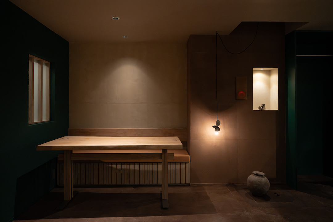 柿渋染めの和紙の壁の部分は、ニッチとペンダントライトと床に何かをしつらえると三点のバランスがよさそう。