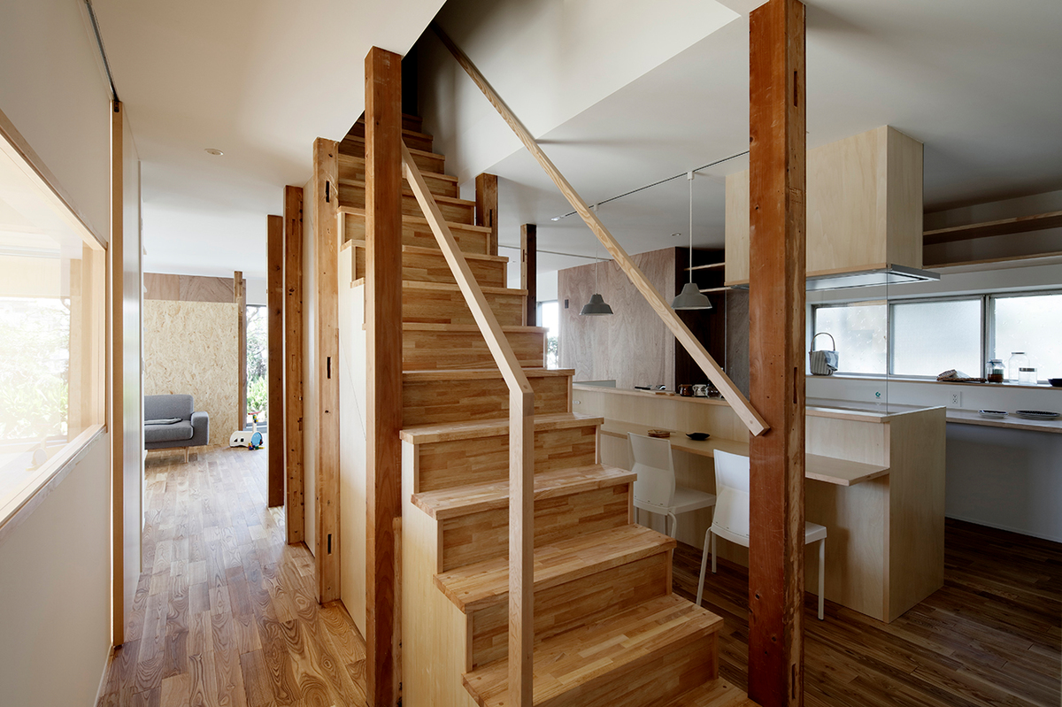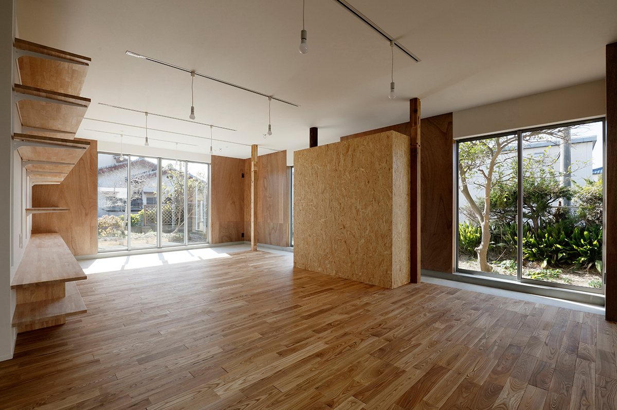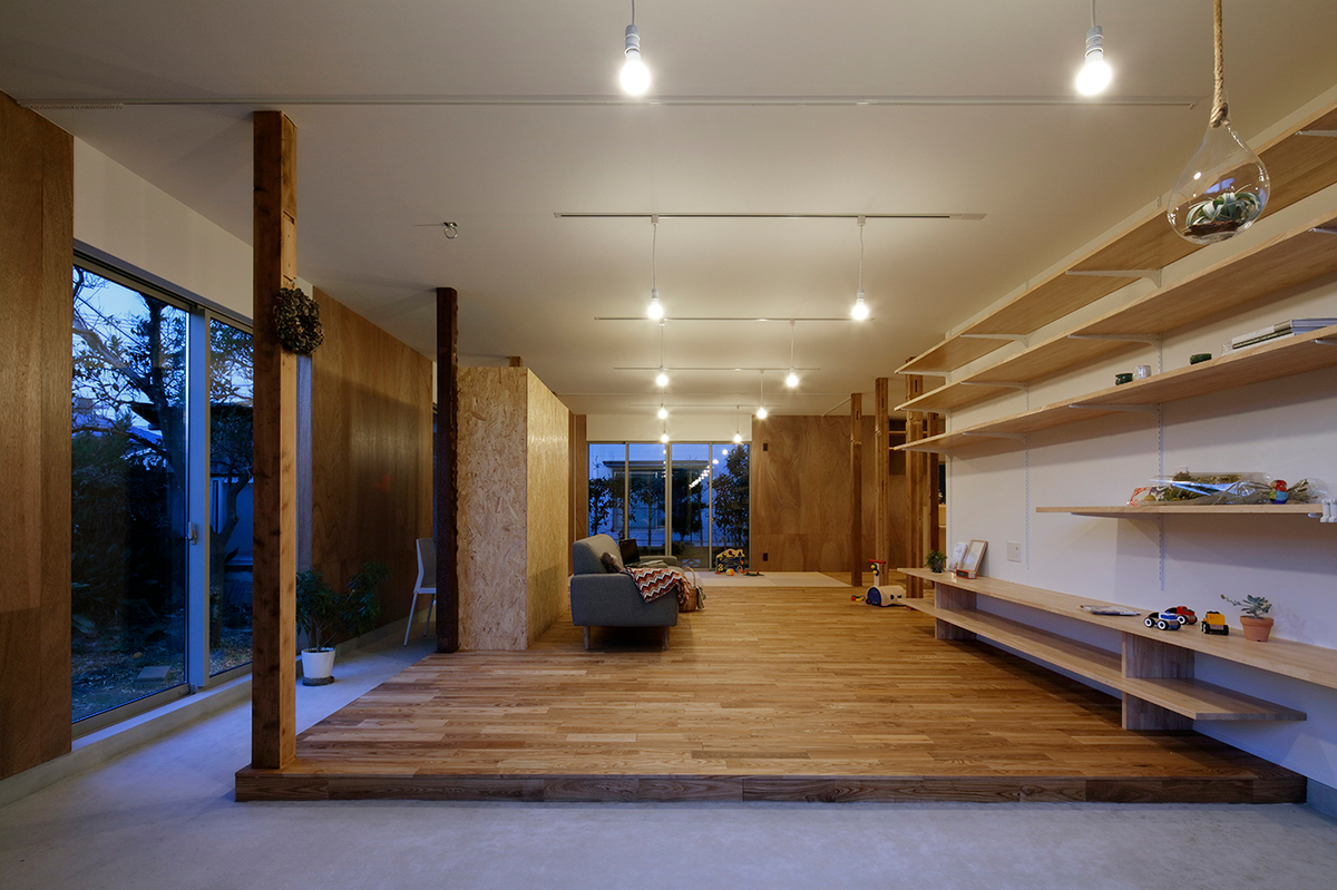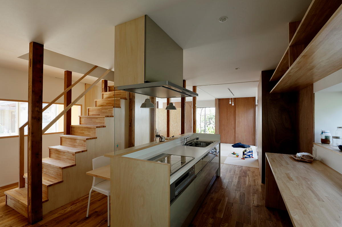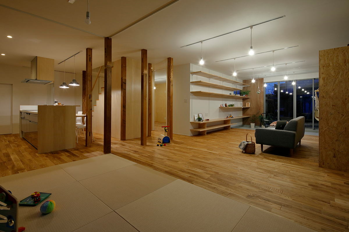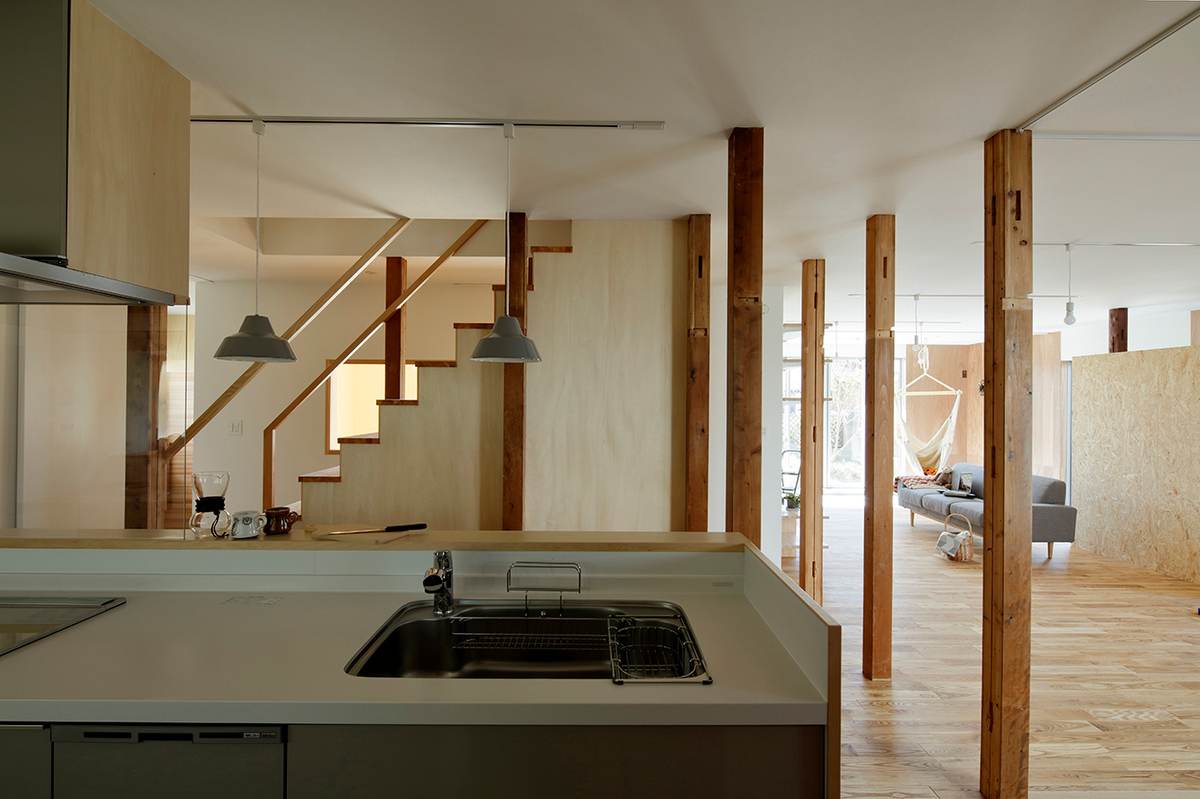 福津の海岸に程近い、ご夫婦とお子さん2人が住む約50年近い中古住宅のリノベーション。周辺は1つ1つの敷地が広く、和風の生け垣や庭を構えている住宅が多い場所。今回の敷地も同じような仕様で造られていました。和風の庭に多くの植物が植えられていたため、庭の植物を整理し、庭と建物(室内)の繋がり、光の取り入れ方を意識しながら計画を進めました。室内は建具や壁で仕切られた部屋となっており、光が入りづらくなっていたので、L字型の庭に対し、リビングダイニングを設け、開口部を新たに追加し、庭からの明るさを取り込めるようにしています。また、庭に面して室内にL字型に土間を設け、子どもたちが雨の日でも汚れを気にせず気兼ねなく遊べ、外部を身近に感じられるような場所としています。庭に面する寝室の窓と廊下の間に設けた開口部により、一番暗かったキッチンにまで光が届くように計画しました。室内は柱を露出し、建設された当時の材料を表に出すことで、建物の時間の流れを意識できるようにし、耐震補強として耐力に必要な壁には合板を貼り、それ以外の壁はクロス貼りとし、室内の仕上げにメリハリをつけています。