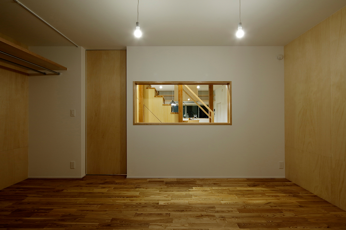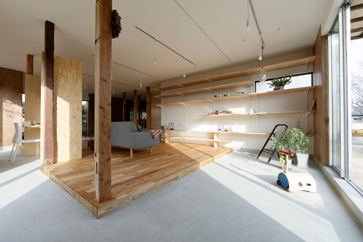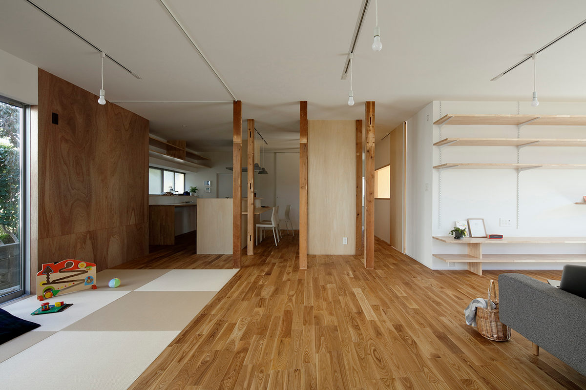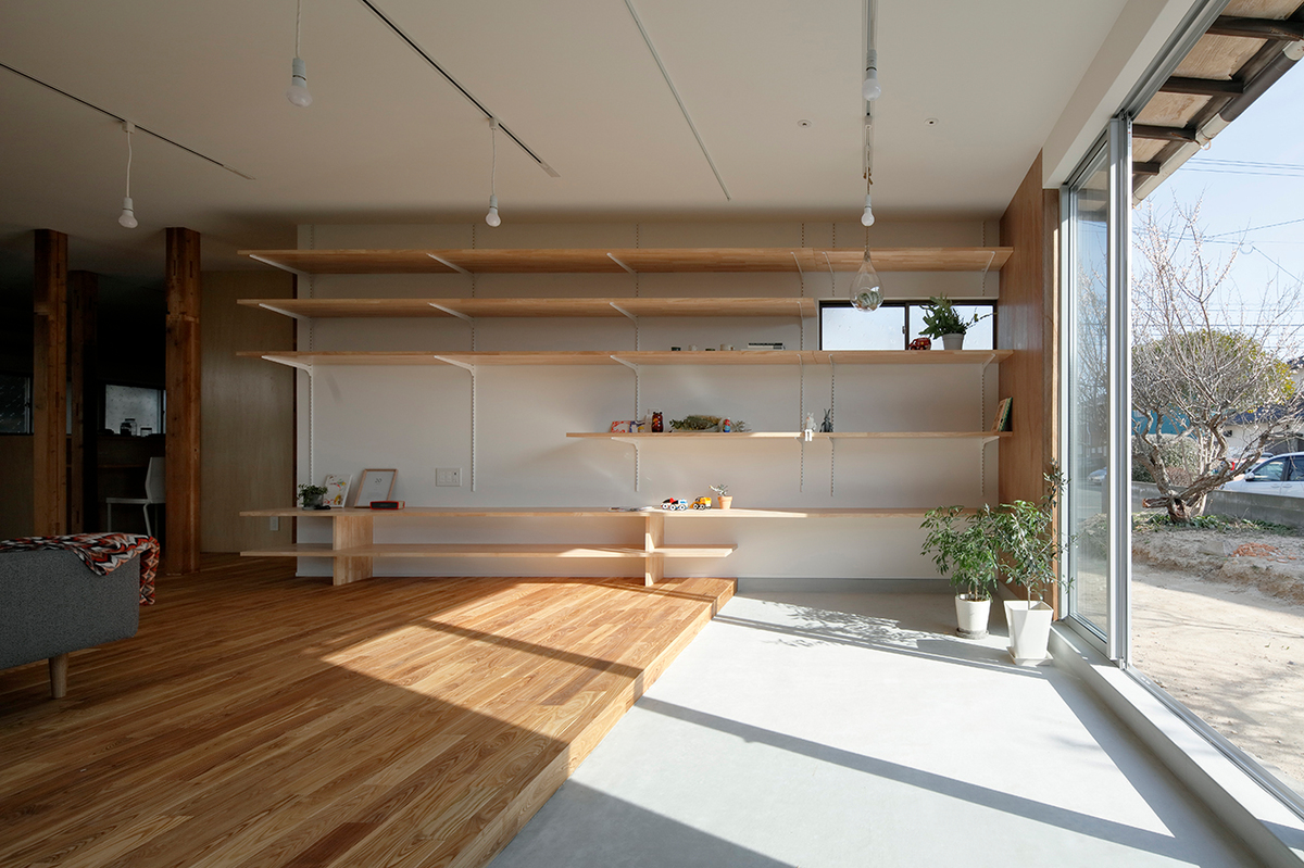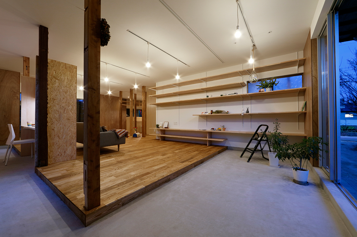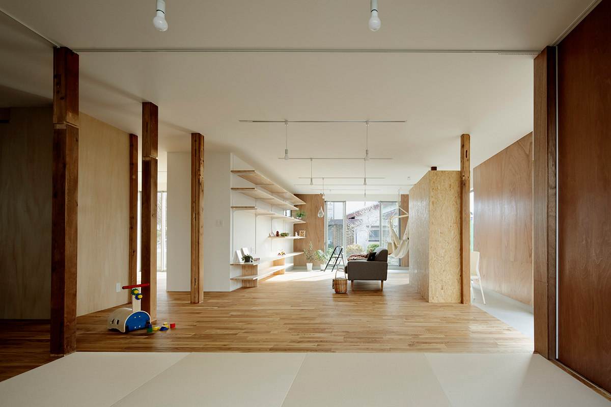 福津の海岸に程近い、ご夫婦とお子さん2人が住む約50年近い中古住宅のリノベーション。周辺は1つ1つの敷地が広く、和風の生け垣や庭を構えている住宅が多い場所。今回の敷地も同じような仕様で造られていました。和風の庭に多くの植物が植えられていたため、庭の植物を整理し、庭と建物(室内)の繋がり、光の取り入れ方を意識しながら計画を進めました。室内は建具や壁で仕切られた部屋となっており、光が入りづらくなっていたので、L字型の庭に対し、リビングダイニングを設け、開口部を新たに追加し、庭からの明るさを取り込めるようにしています。また、庭に面して室内にL字型に土間を設け、子どもたちが雨の日でも汚れを気にせず気兼ねなく遊べ、外部を身近に感じられるような場所としています。庭に面する寝室の窓と廊下の間に設けた開口部により、一番暗かったキッチンにまで光が届くように計画しました。室内は柱を露出し、建設された当時の材料を表に出すことで、建物の時間の流れを意識できるようにし、耐震補強として耐力に必要な壁には合板を貼り、それ以外の壁はクロス貼りとし、室内の仕上げにメリハリをつけています。
