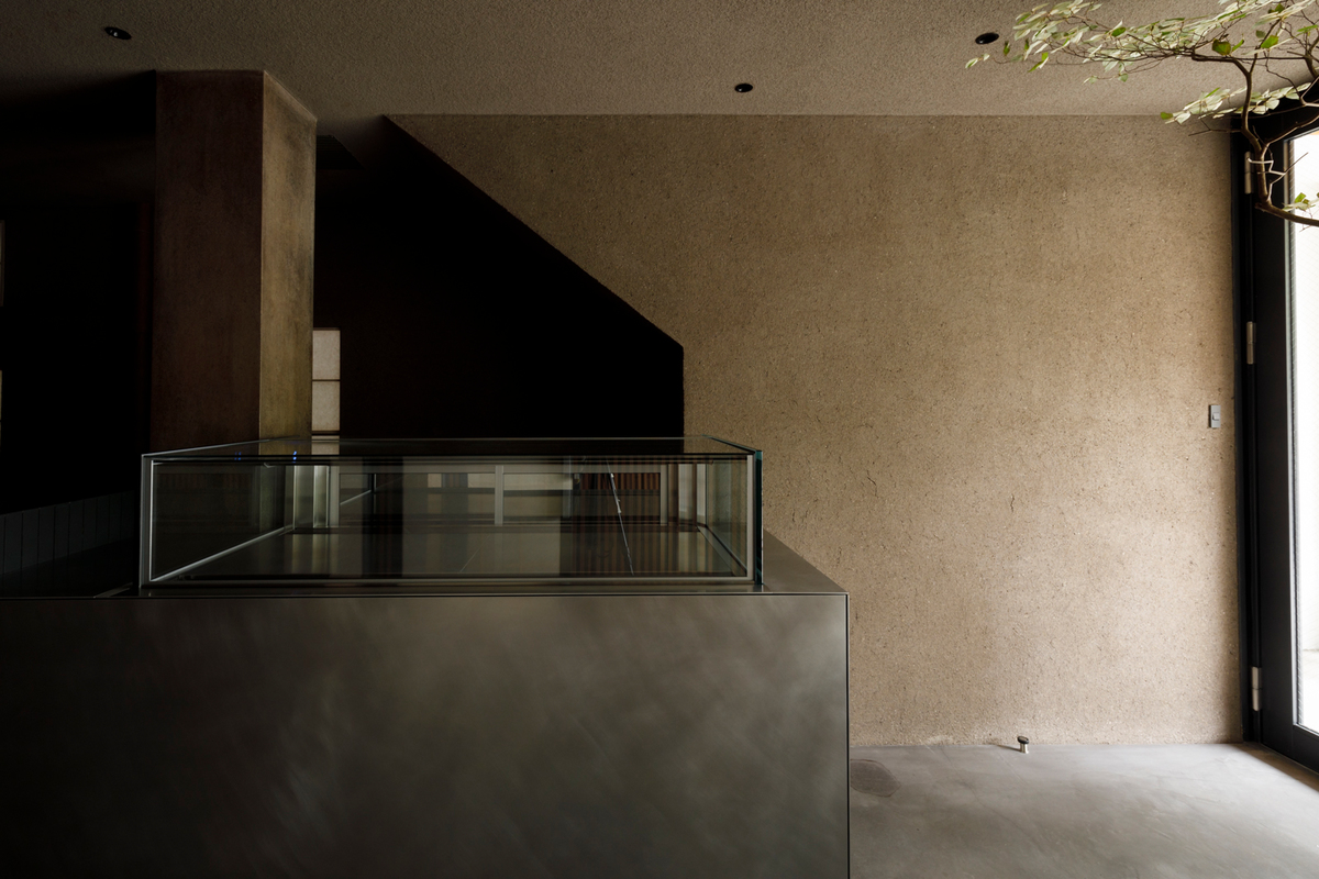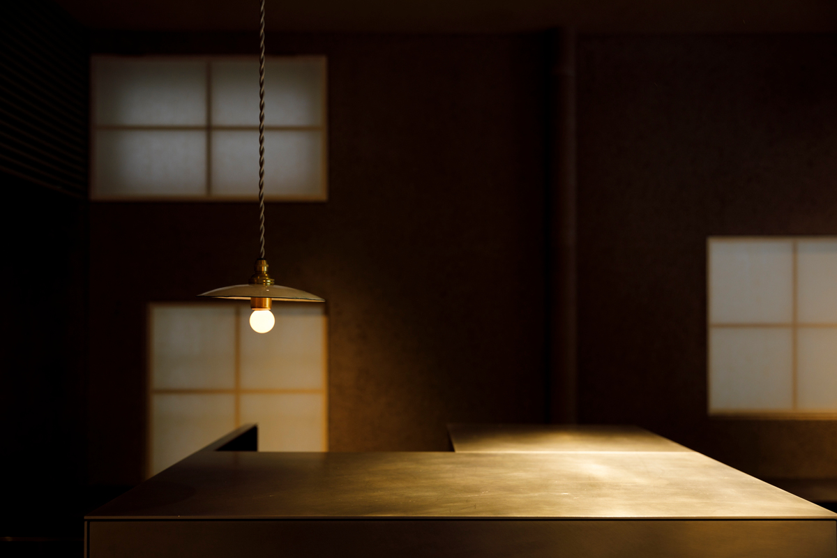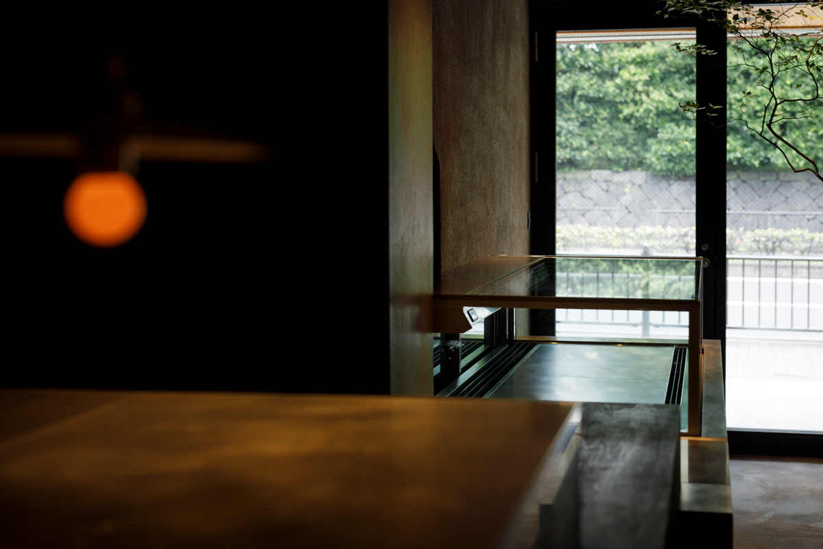 木製什器の仕上げは奈良の古梅園の墨を用い塗り重ね、アルミのソフトブラッシング仕上げの表情と共に静けさを生み出している。