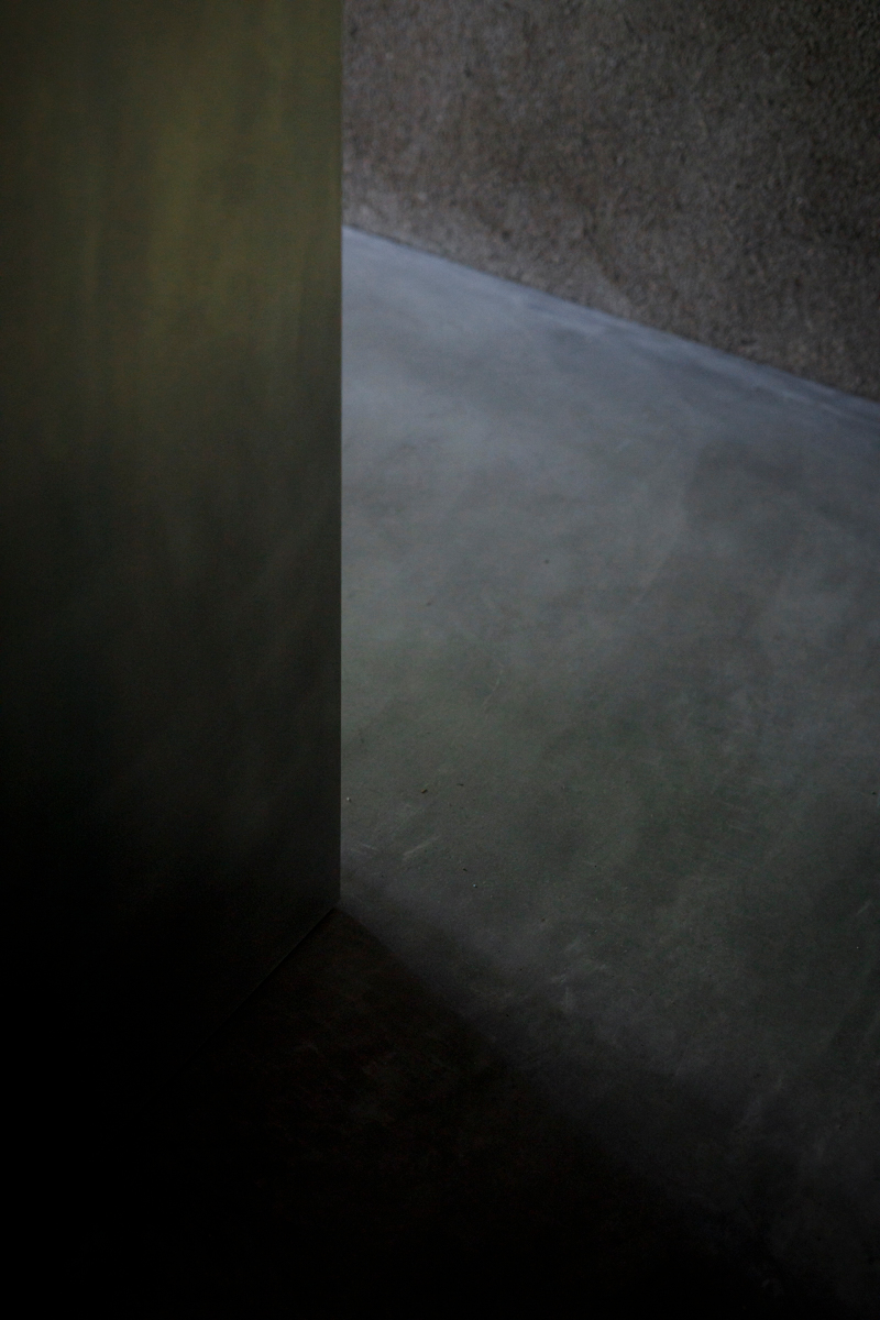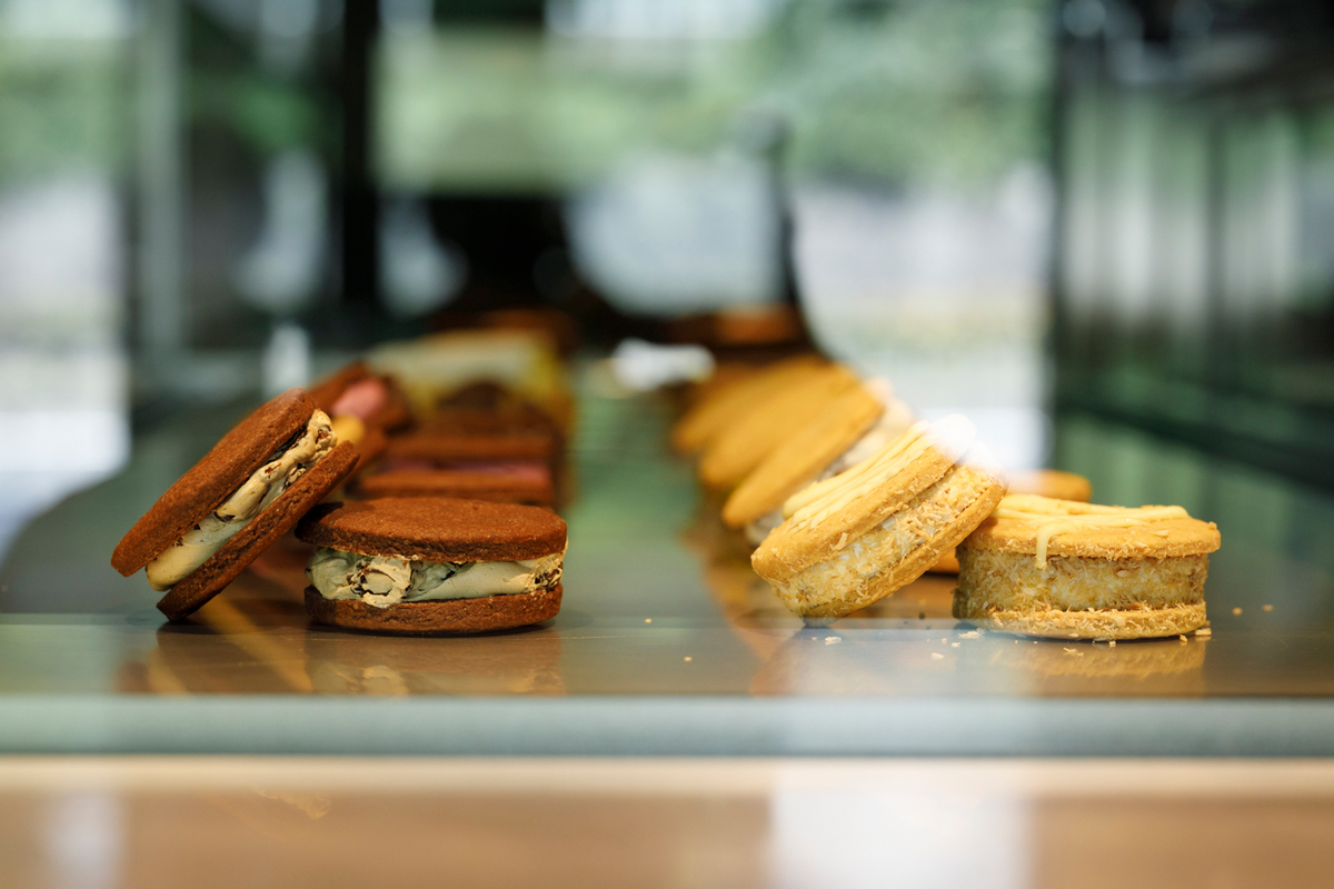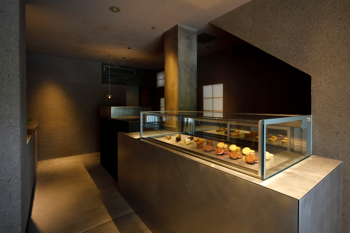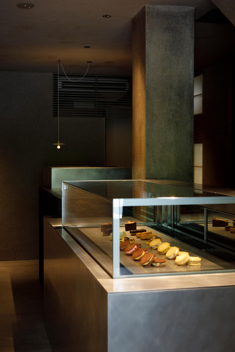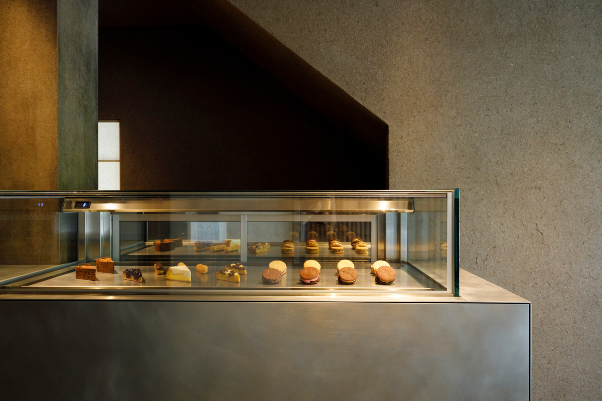 店内の中央にアルミの切板と木製の什器が奥へ向かって雁行していく。奥へ向かうほどに店内は暗がりになり、見返すと御所の風景は眩く明るい。都会の喧騒から離れて、素材の活きたスイーツを食する場があることは、木陰で身体を休めるかのように尊いことである。