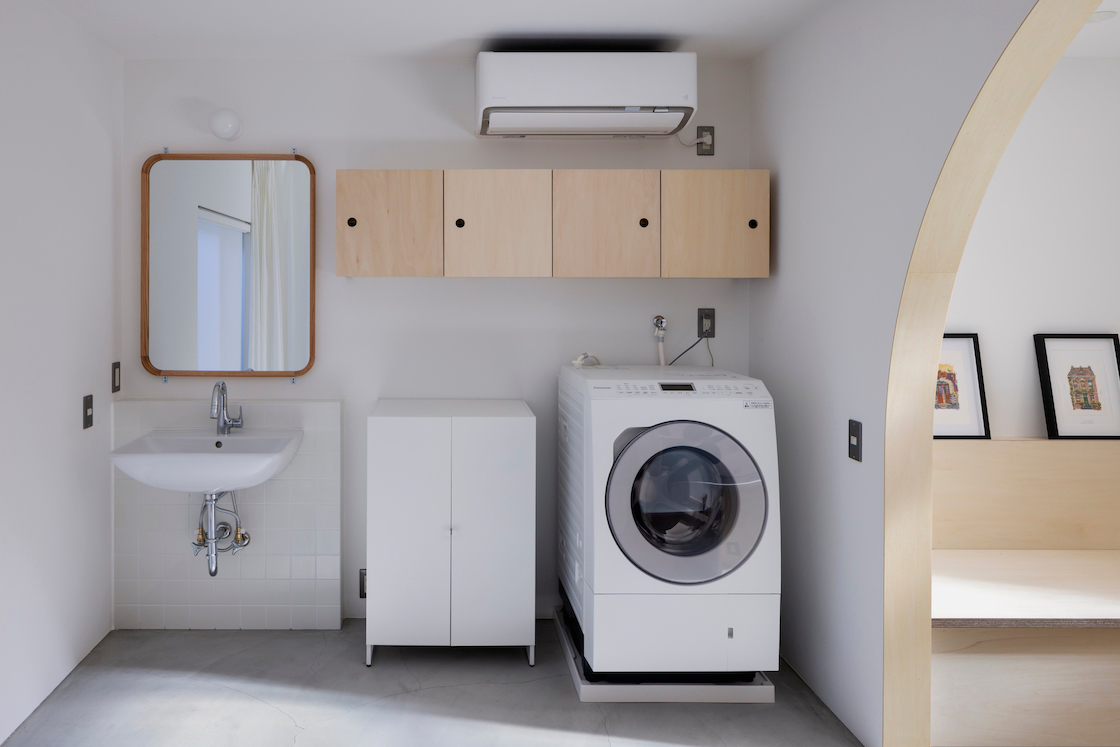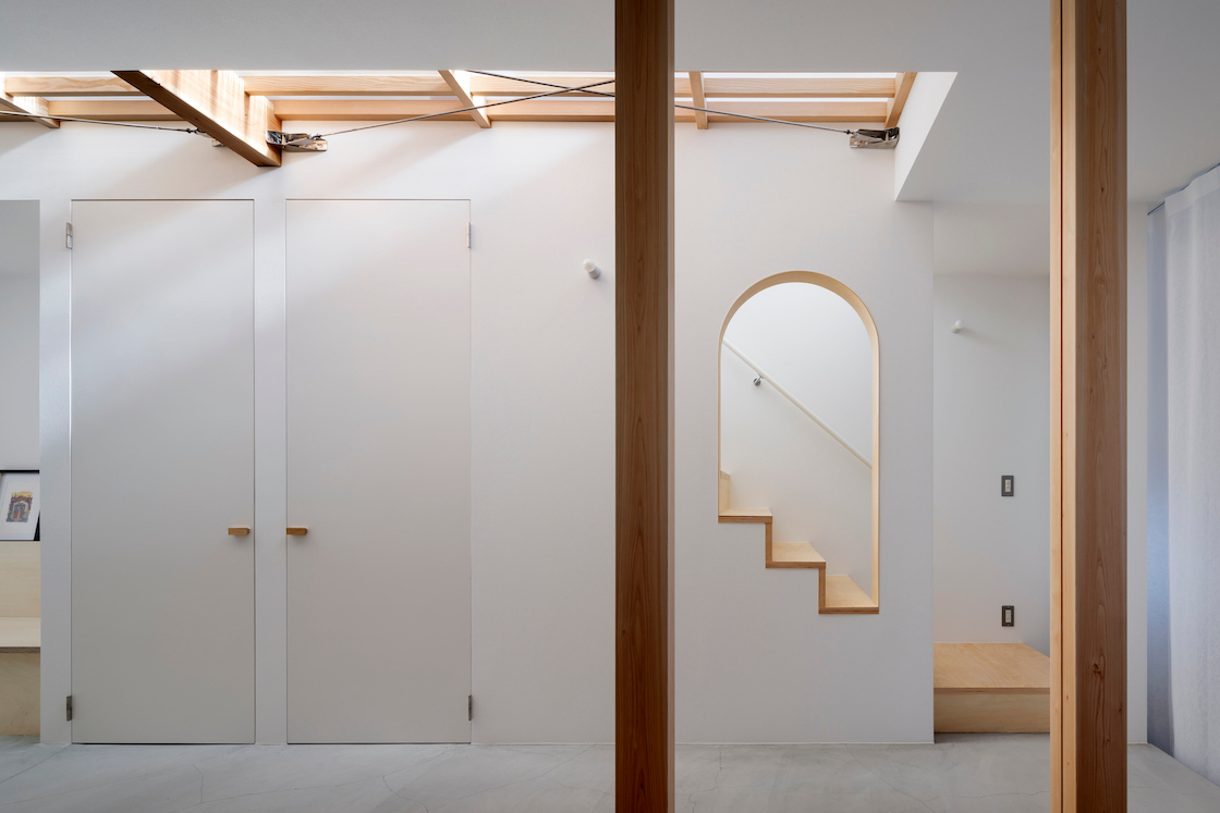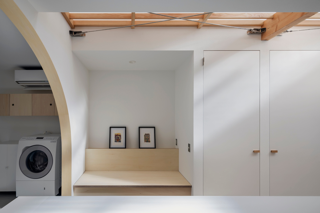 1階には南道路に面した大窓があるが、プライバシーの観点から居室と少し距離が欲しい。そこで窓と居室の間に縁側のように土間空間を設け、居室側と窓双方にカーテンを設置することで、光や視線の調整のみならず、縁側、居室の一部、玄関の延長など、用途の編集を受け入れられる空間とした。