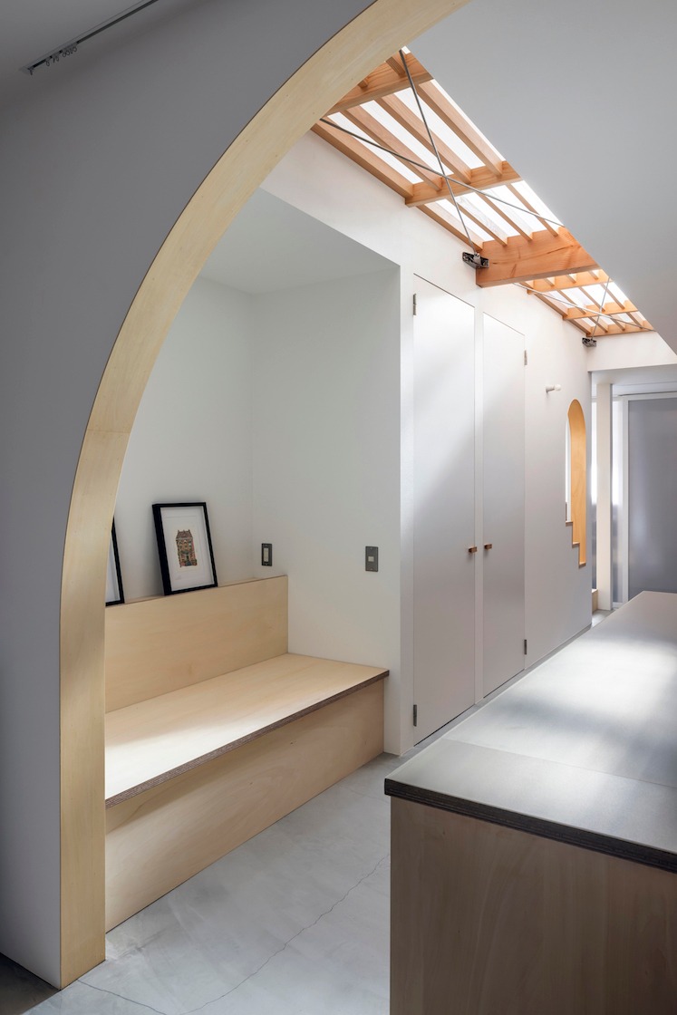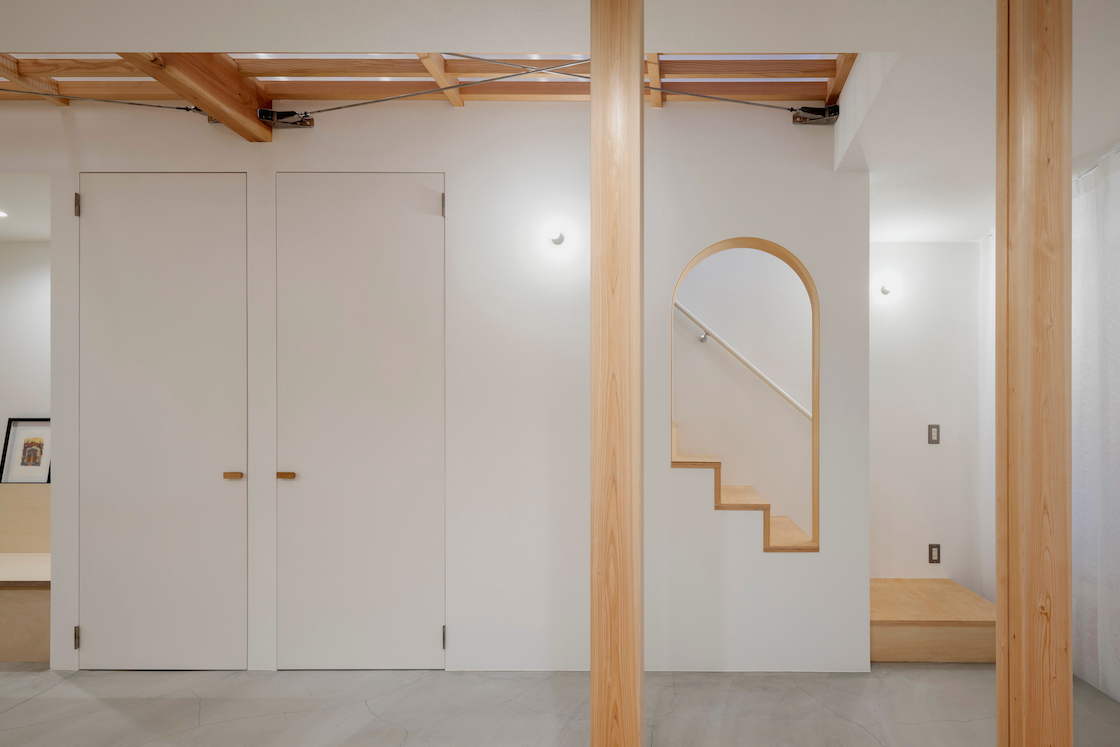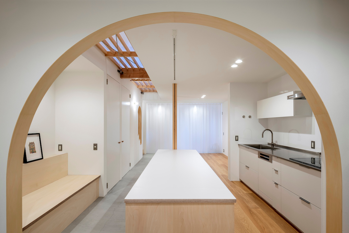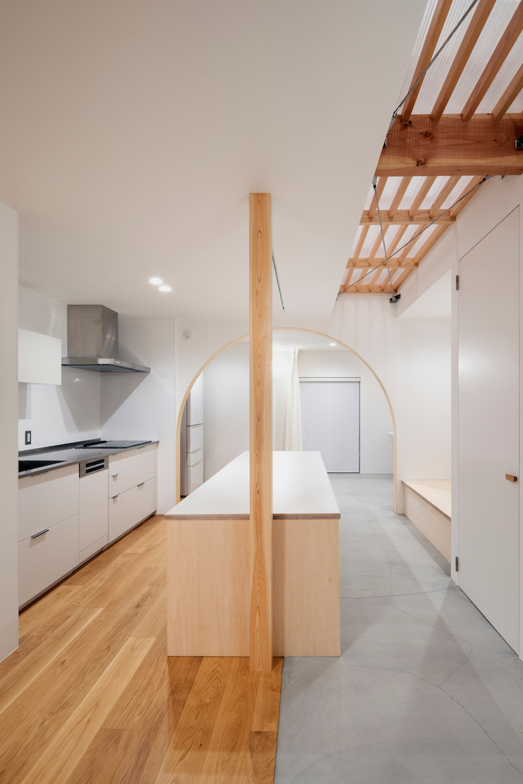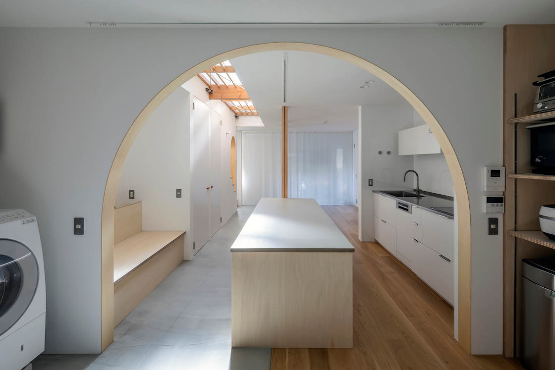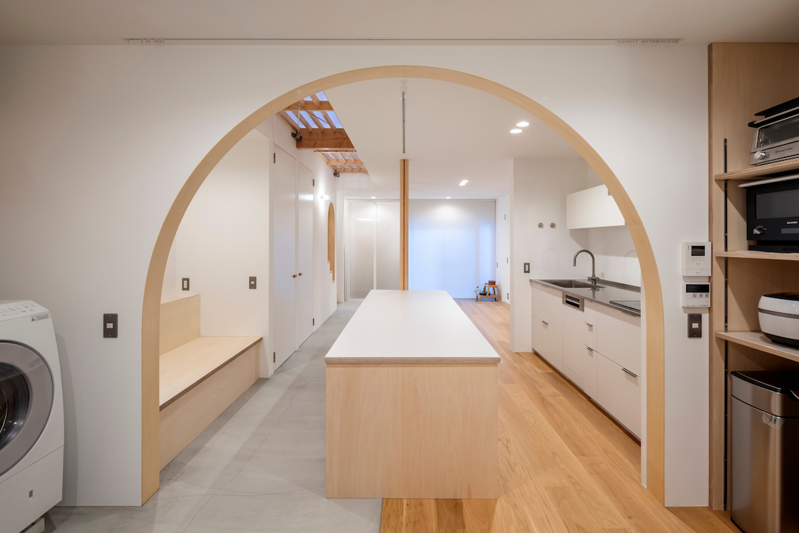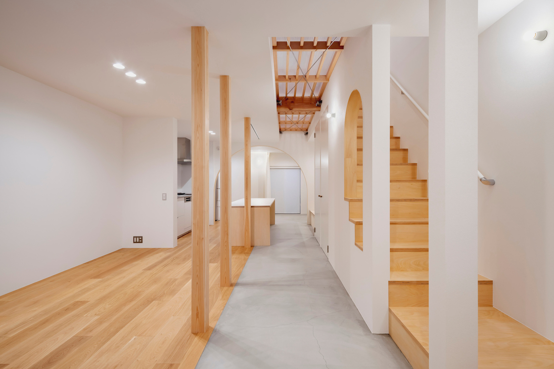 ワンルーム構成である1階全体は、単調で間延びした印象とならないよう、アール垂れ壁や仕上げの切替えで緩やかにゾーン分けを行い、また機能や居場所を散りばめることで拠り所のある空間となるよう企図した。