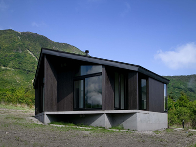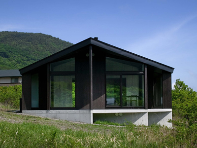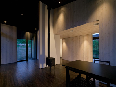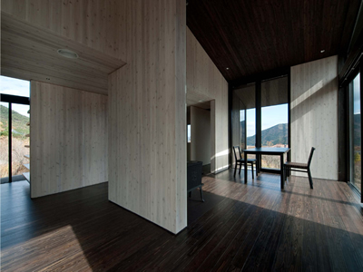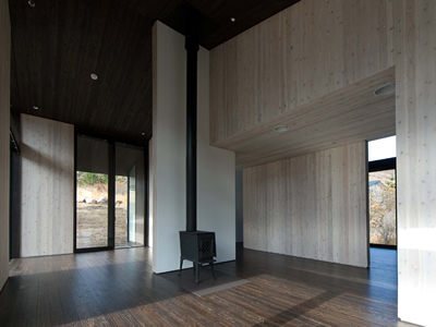 建物の様々な方向に大きな開口部を設け、周囲の素晴しい景色を色んな角度から楽しめる別荘です。内装は浸透性の塗装を施した杉板だけで構成し、温かみのあるシンプルな空間を実現しました。