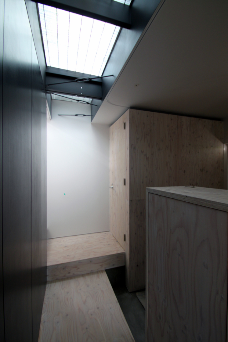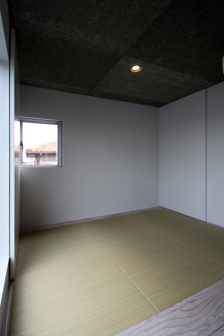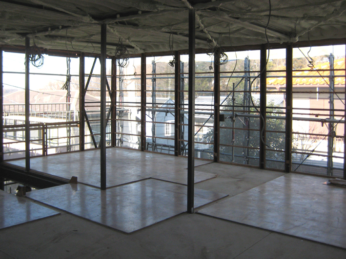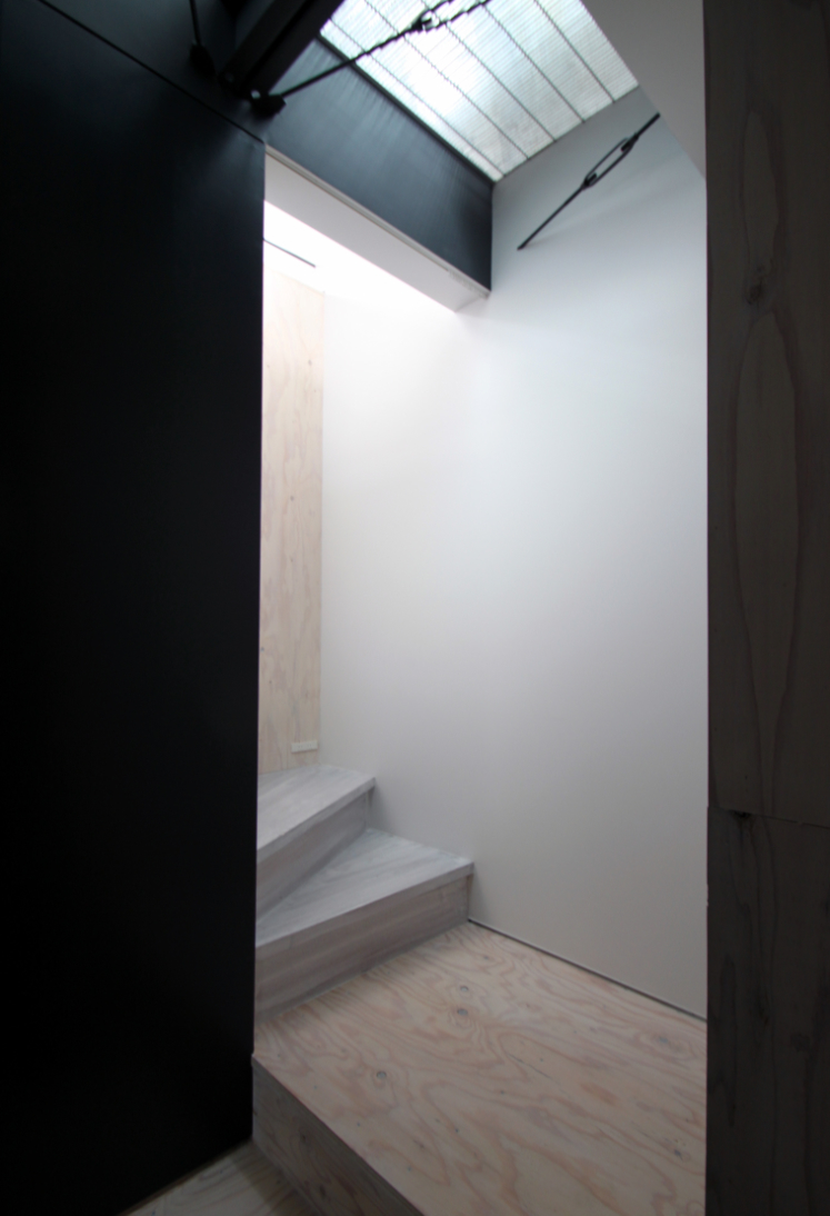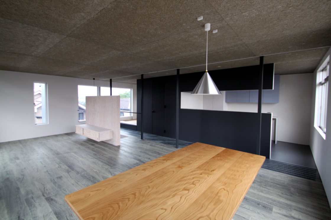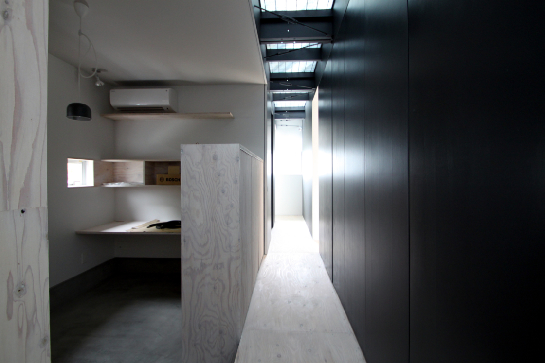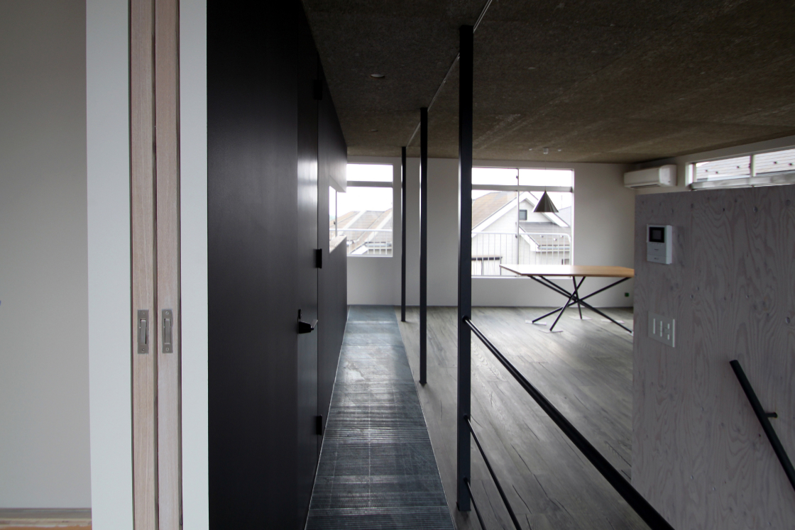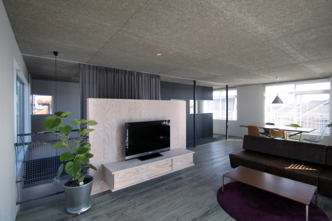 内部は構造上主要な部分を残し新装している。プレハブ特有の細い構造材を露出してインテリアに取入れ,2F床を一部グレーチングにして二層に分断されていた空間に広がりと変化を与えた。