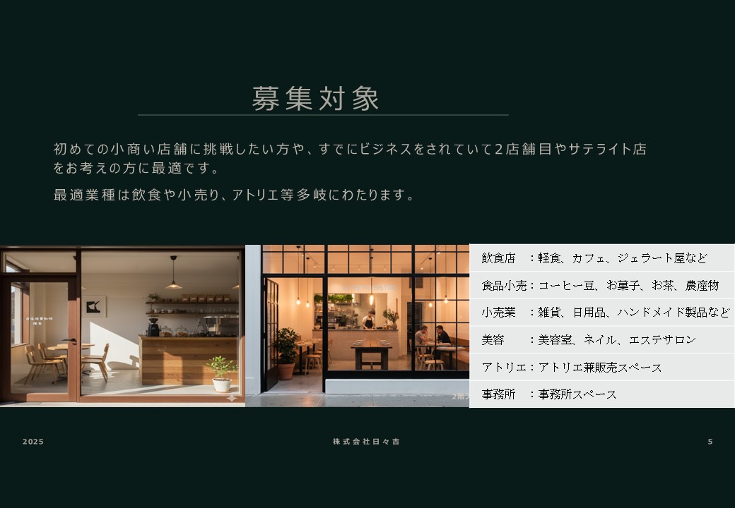 初めての小商い店舗に挑戦したい方や、すでにビジネスをされていて2店舗目やサテライト店をお考えの方に最適です。