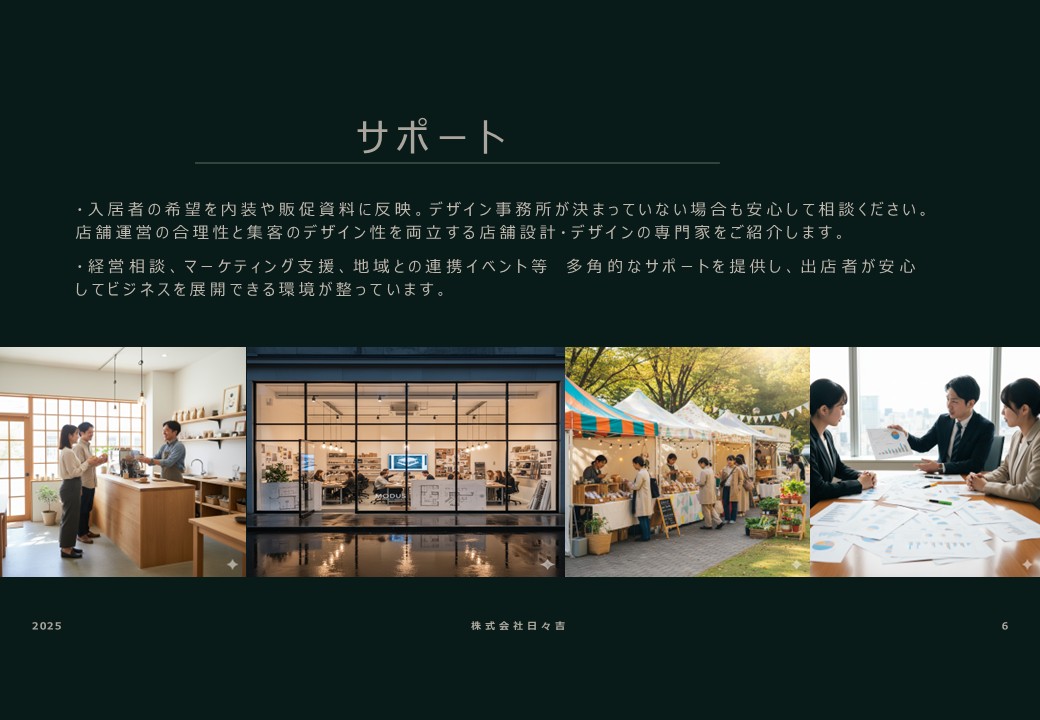 経営相談・マーケティング支援・地域連携イベント:多角的なサポートを提供し、出店者が安心してビジネスを展開できる環境が整っています。